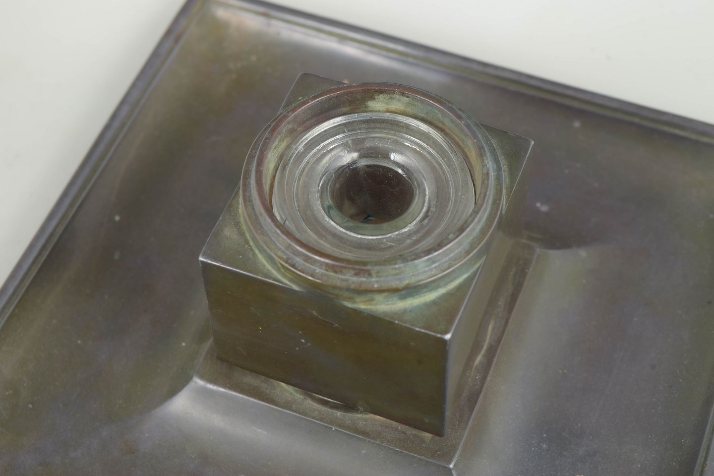 Blækhus i diskometal med kvadratisk bakke og original glasindsats, toppet med riflet låg i klassisk art deco formsprog.
