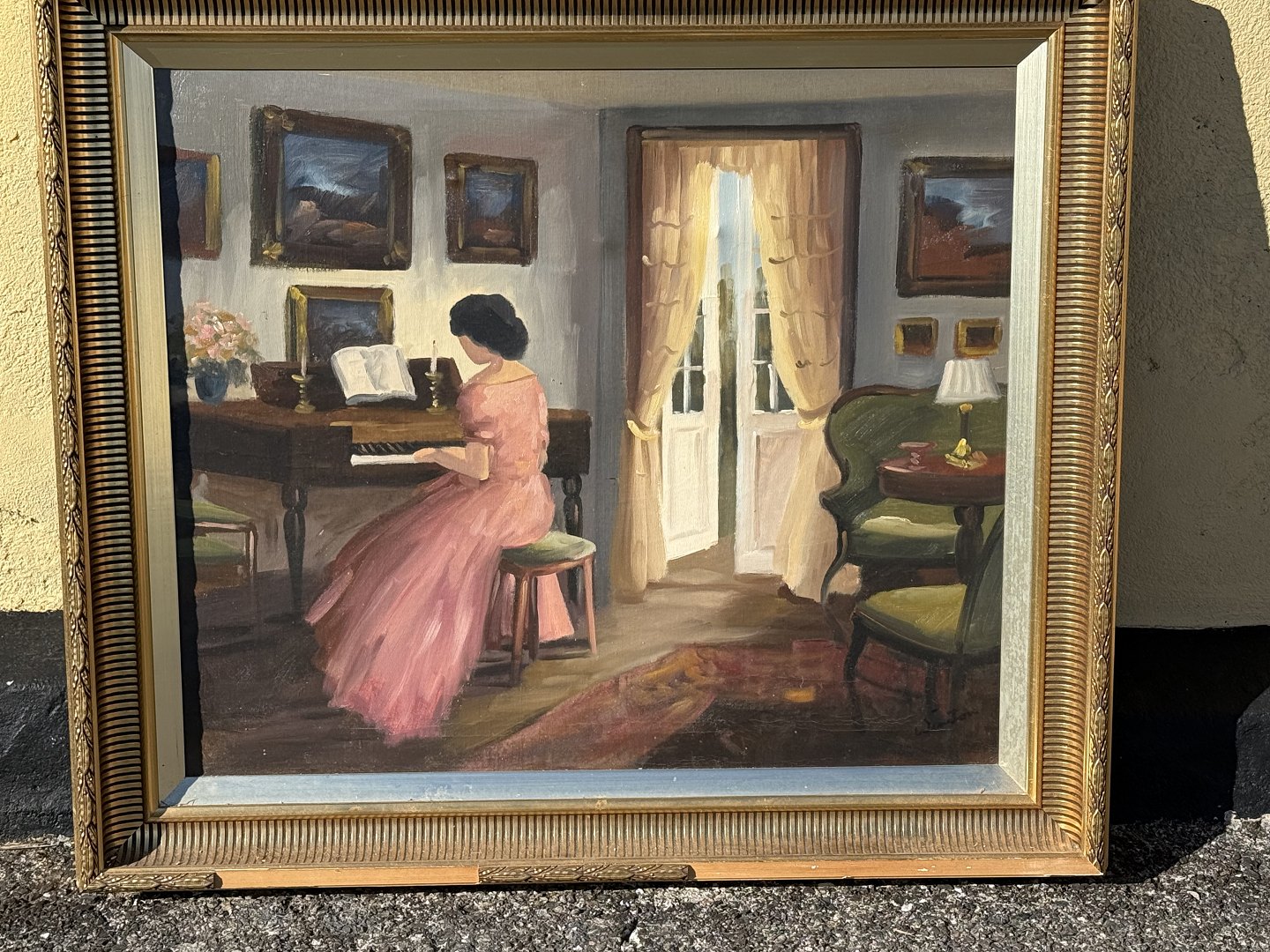 Kvinde i lyserød kjole ved pianette, oliemaleri på lærred, utydeligt signeret *fremstår med en del afslag på rammen ellers pæn stand*