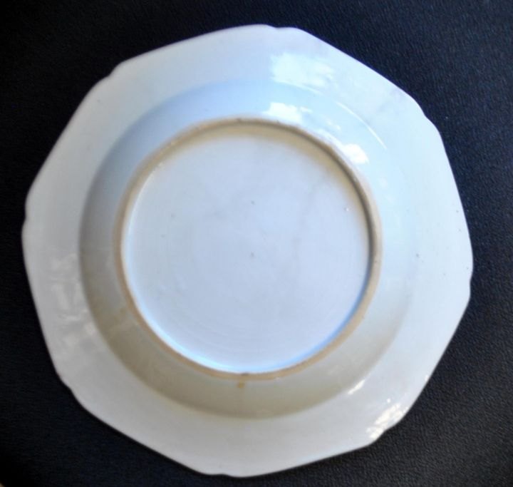 Kinesisk blå/hvid tallerken, 18. årh. Chien-Lung. 8 kantet. Håndmalede dekorationer af landskaber og blomster. Dia.: 22 cm.
