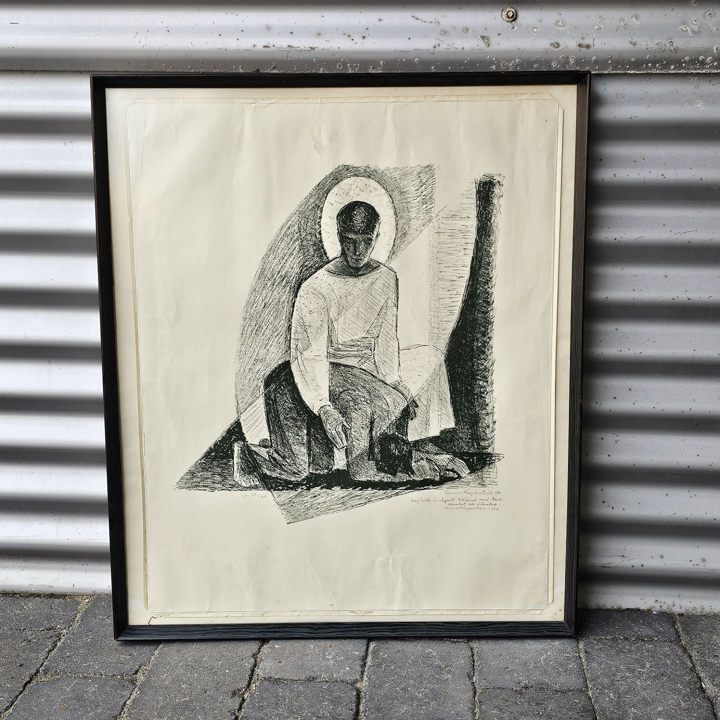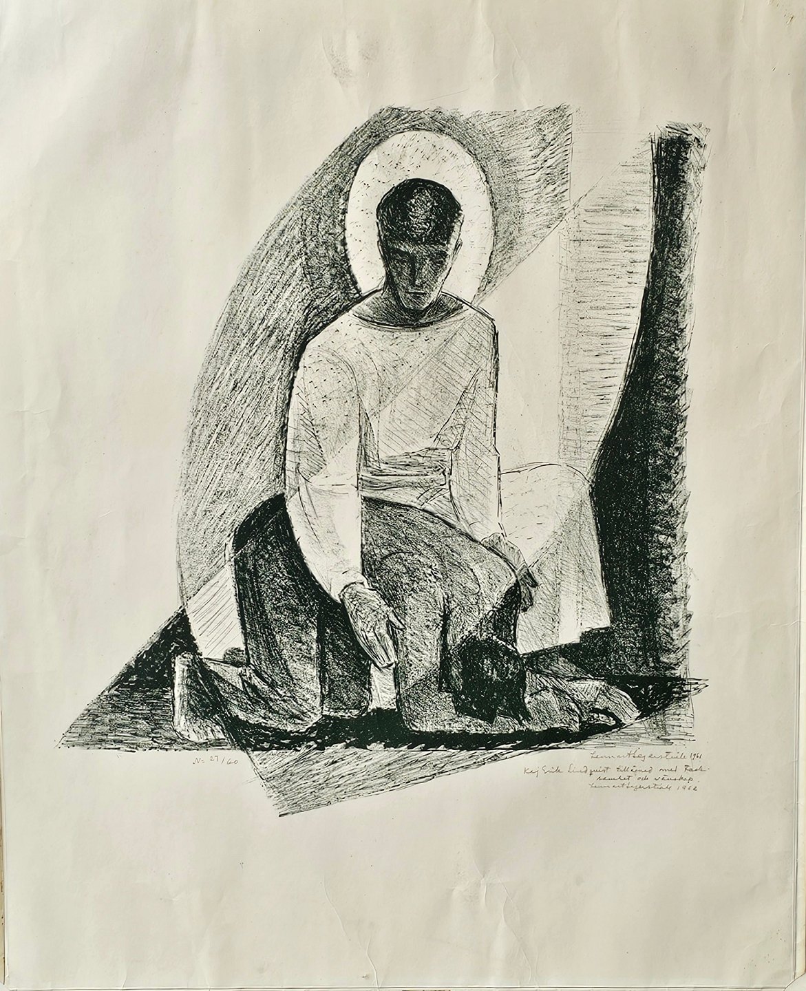 Litografi med motiv af en engel, som står over en mand på knæ. Monteret i sortmalet ramme, Tilegnet Kaj Erik Lindqvist