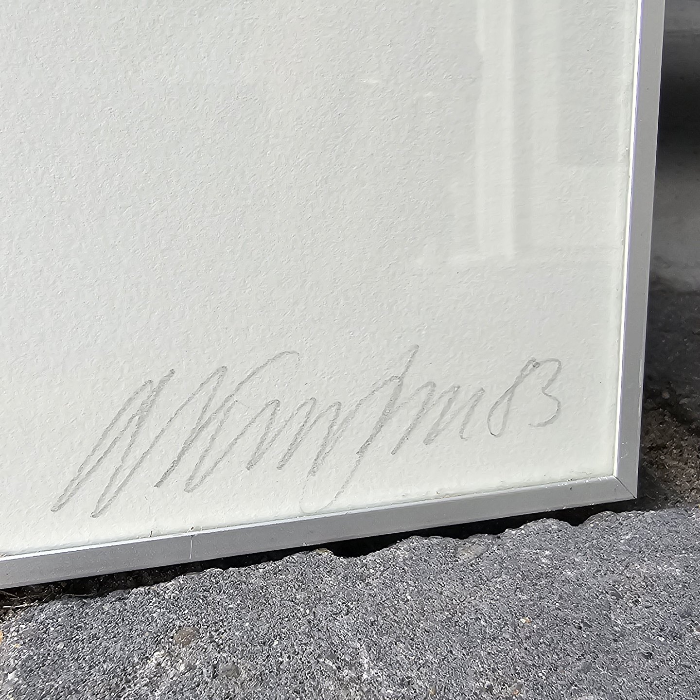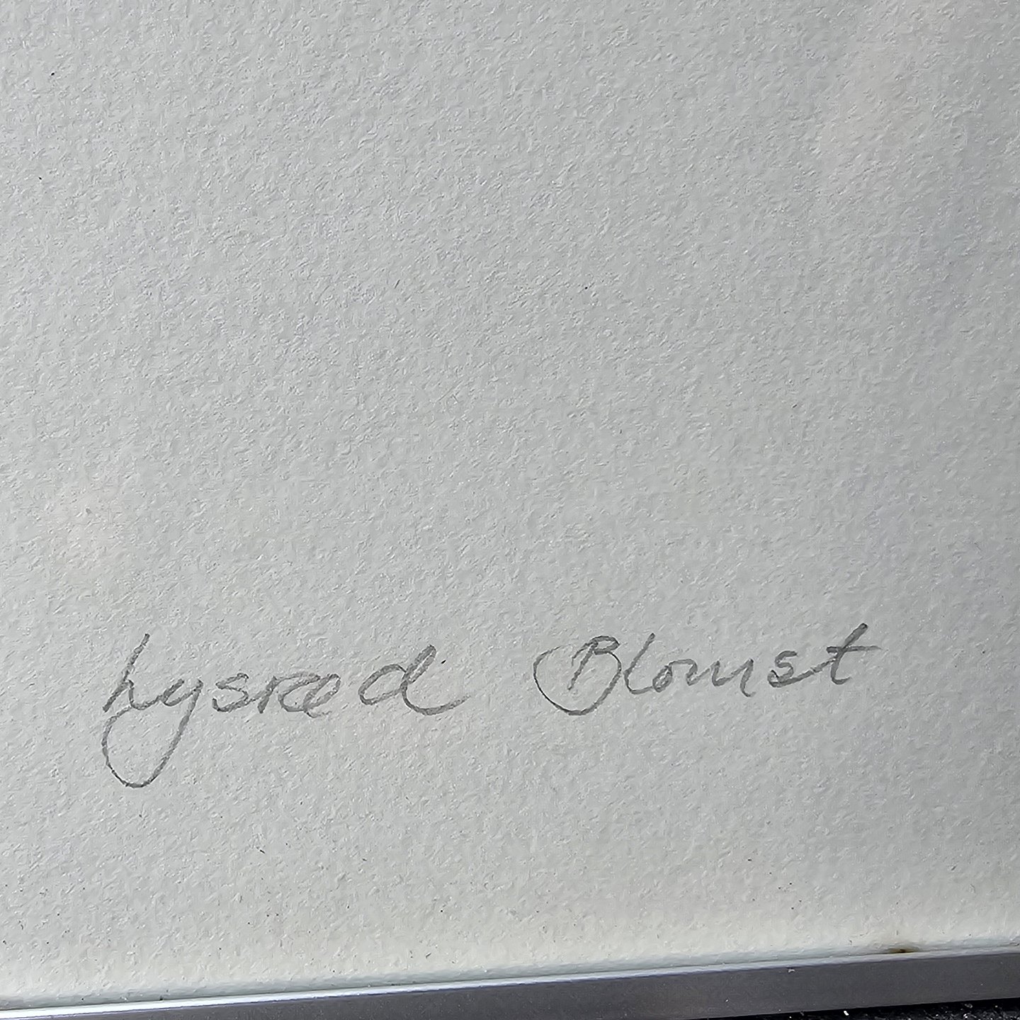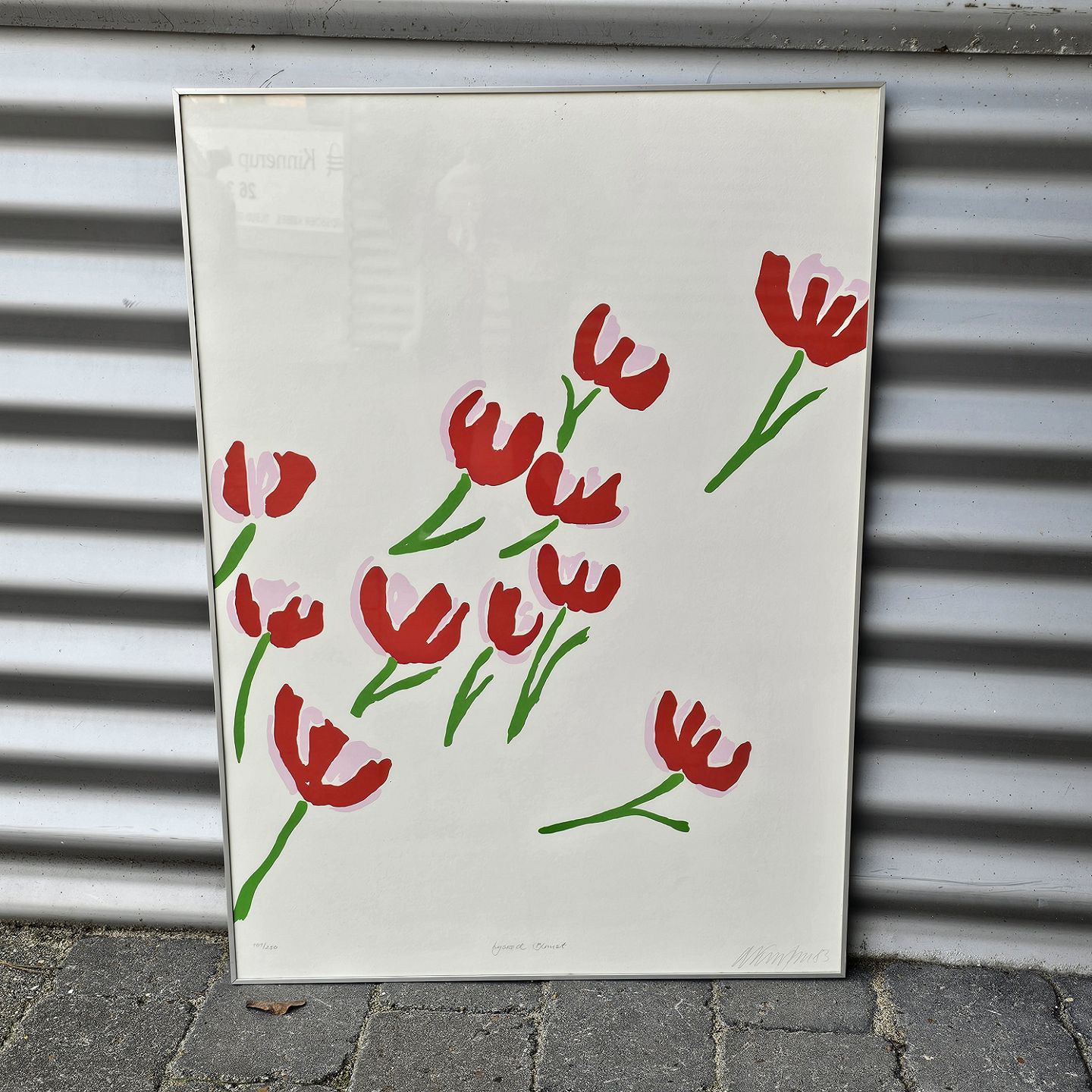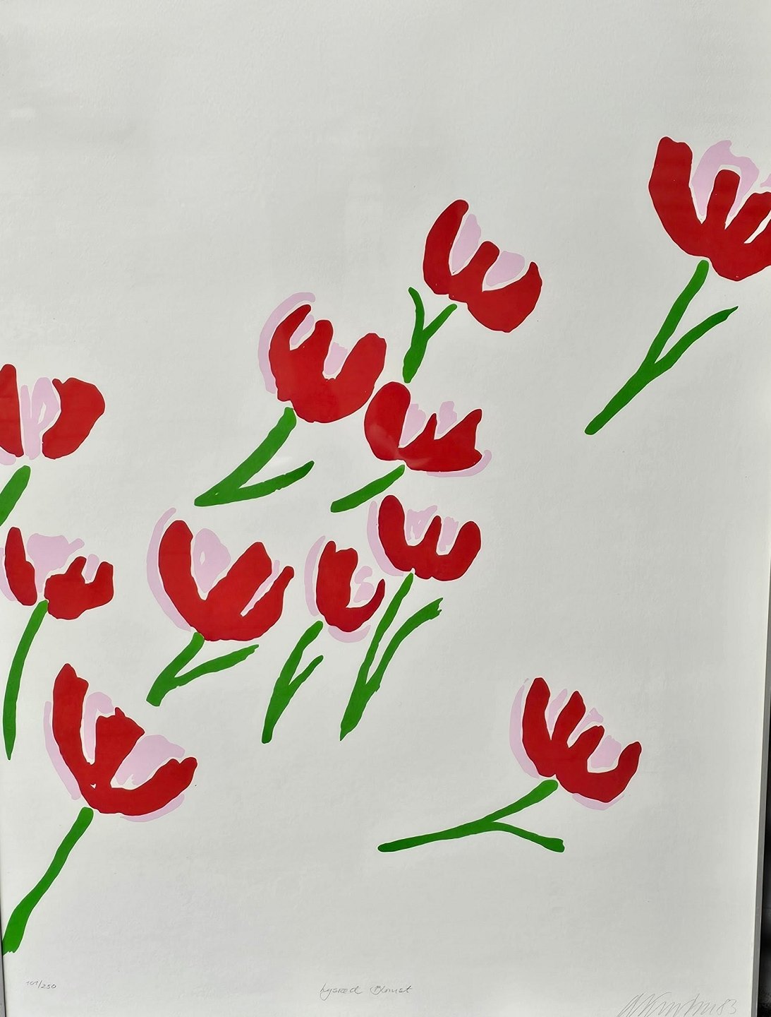Litografi med motiv af lyserøde blomster monteret i metal ramme