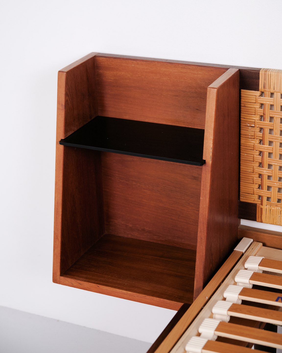 Model GE 701 dobbeltseng designet af Hans J. Wegner og fremstillet hos Getama i 1950’erne. Udført i fineret og massivt teaktræ. Gavle med sjeneflet og sort kunstlæder. Hovedgavl med integrerede sengeborde med hylder i sort glas samt underliggende hylde. Messingbeslag. Hans J. Wegner samarbejdede gennem mange år med Getama og udviklede flere møbler i teak til boligindretning og soveværelse.