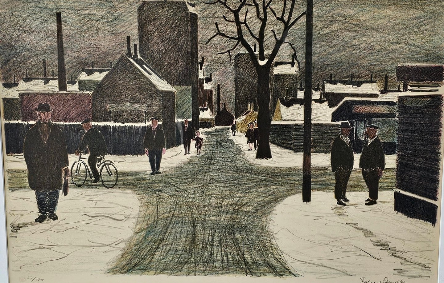 Litografi på papir med motiv af mennesker i et gadekryds. Monteret i sortmalet træramme