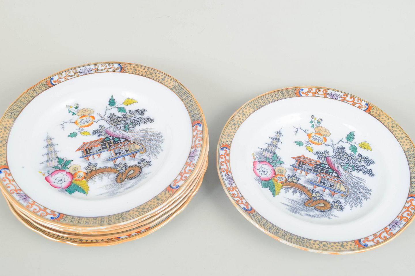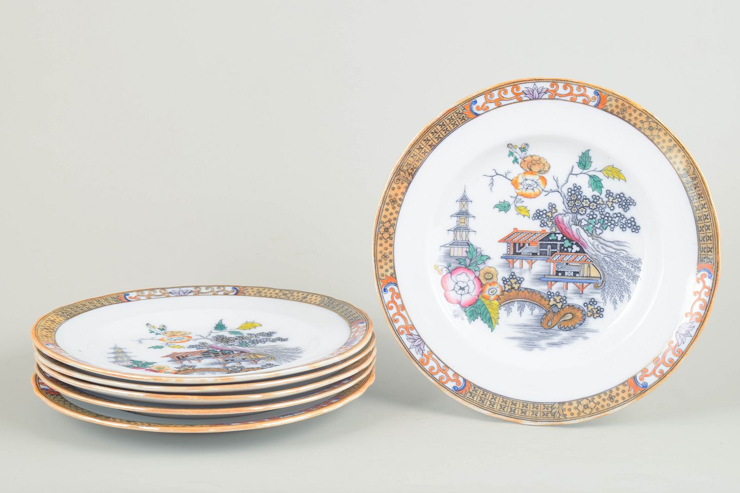 Dinner plates in faience with oriental-inspired decoration in polychrome colours and finely detailed painting in Japanese style, characteristic of Rörstrand’s japonisme production from the early 20th century.