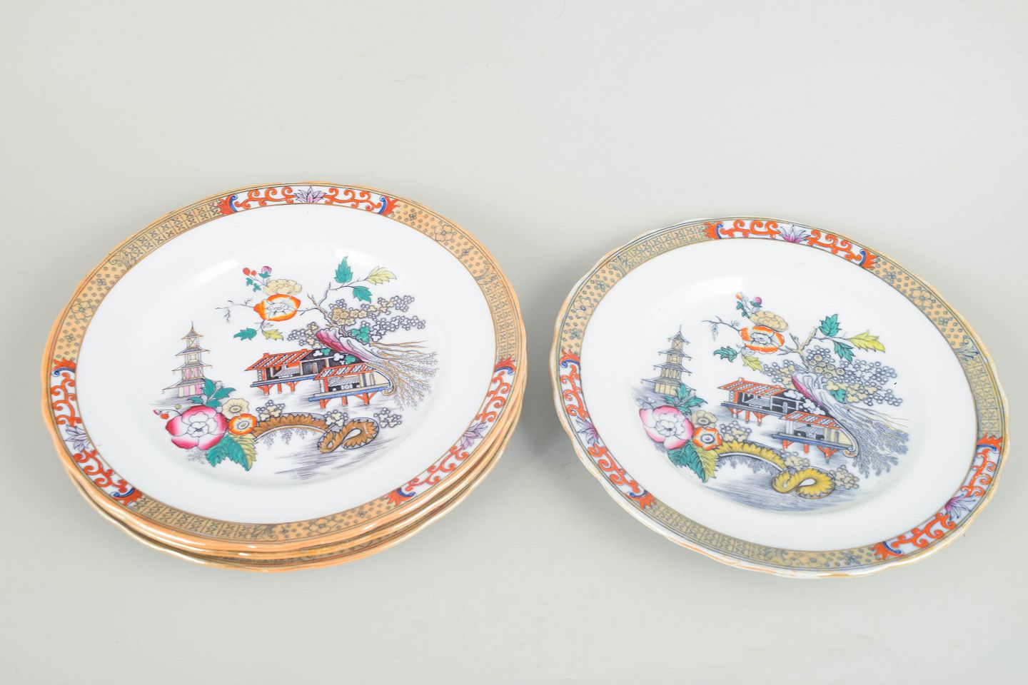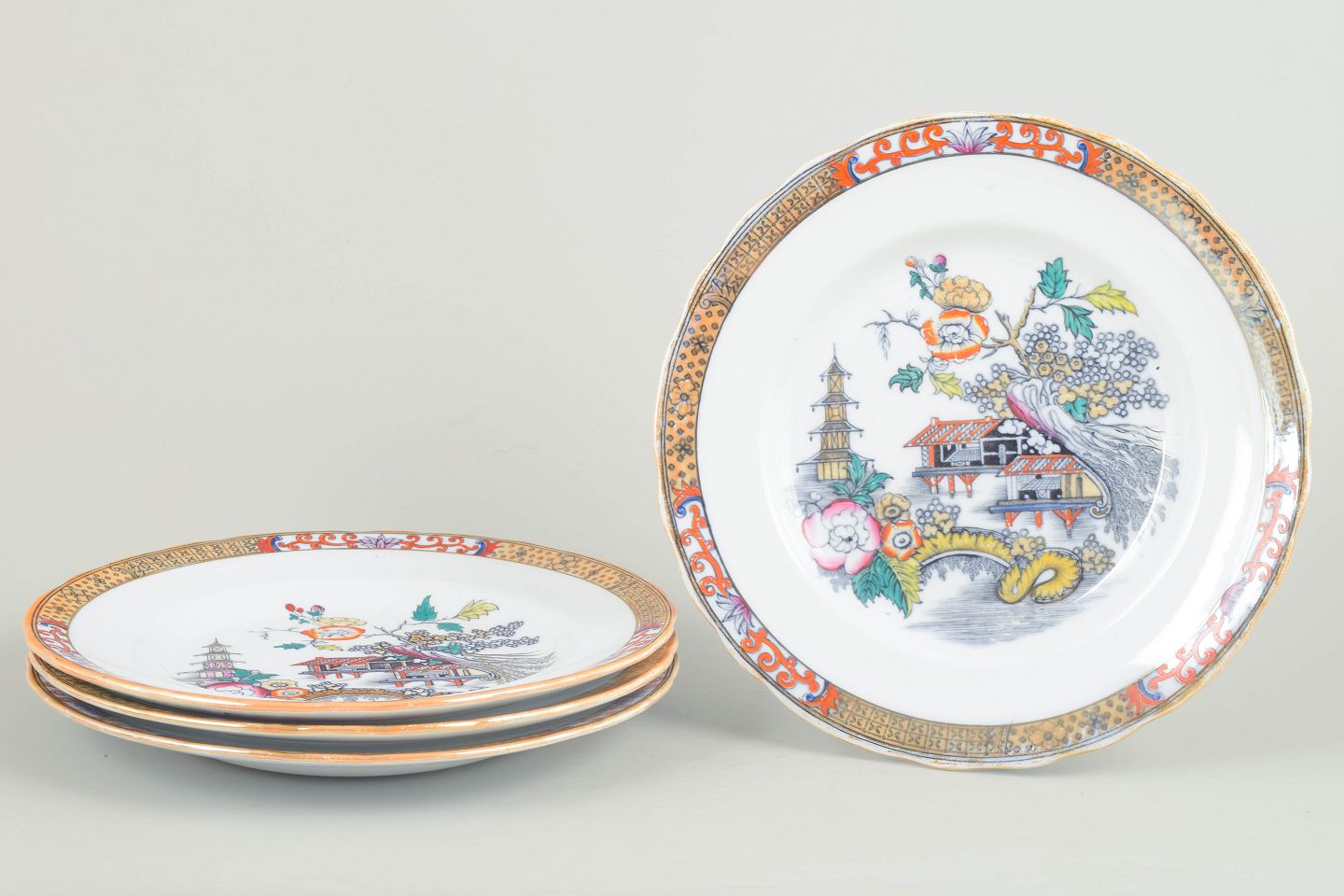 Dinner plates in faience with oriental-inspired decoration in polychrome colours and finely detailed painting in Japanese style, characteristic of Rörstrand’s japonisme production from the early 20th century.
