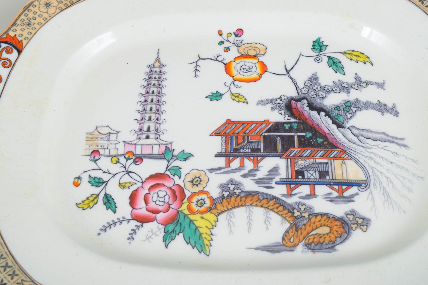 Large serving dishes in faience with oriental-inspired decoration in polychrome colours and finely detailed painting in Japanese style, characteristic of Rörstrand’s japonisme production from the early 20th century.
