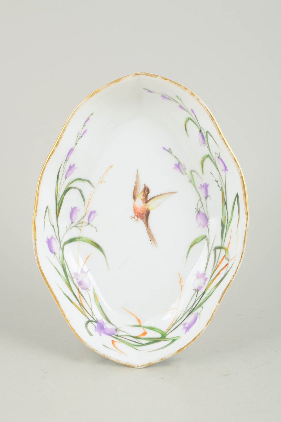 Antikt ovalt fad i håndmalet porcelæn med centralt fuglemotiv og blomsterdekoration i lilla og grønne nuancer, afsluttet med guldkant langs randen.