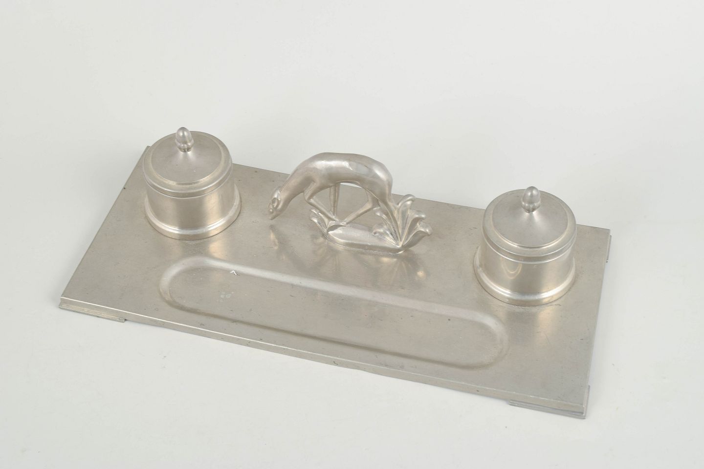 Rektangulært blækhus i tin med to beholdere og dekorativ hjortefigur i midten. Den ene glasindsats mangler. Stemplet under bunden.