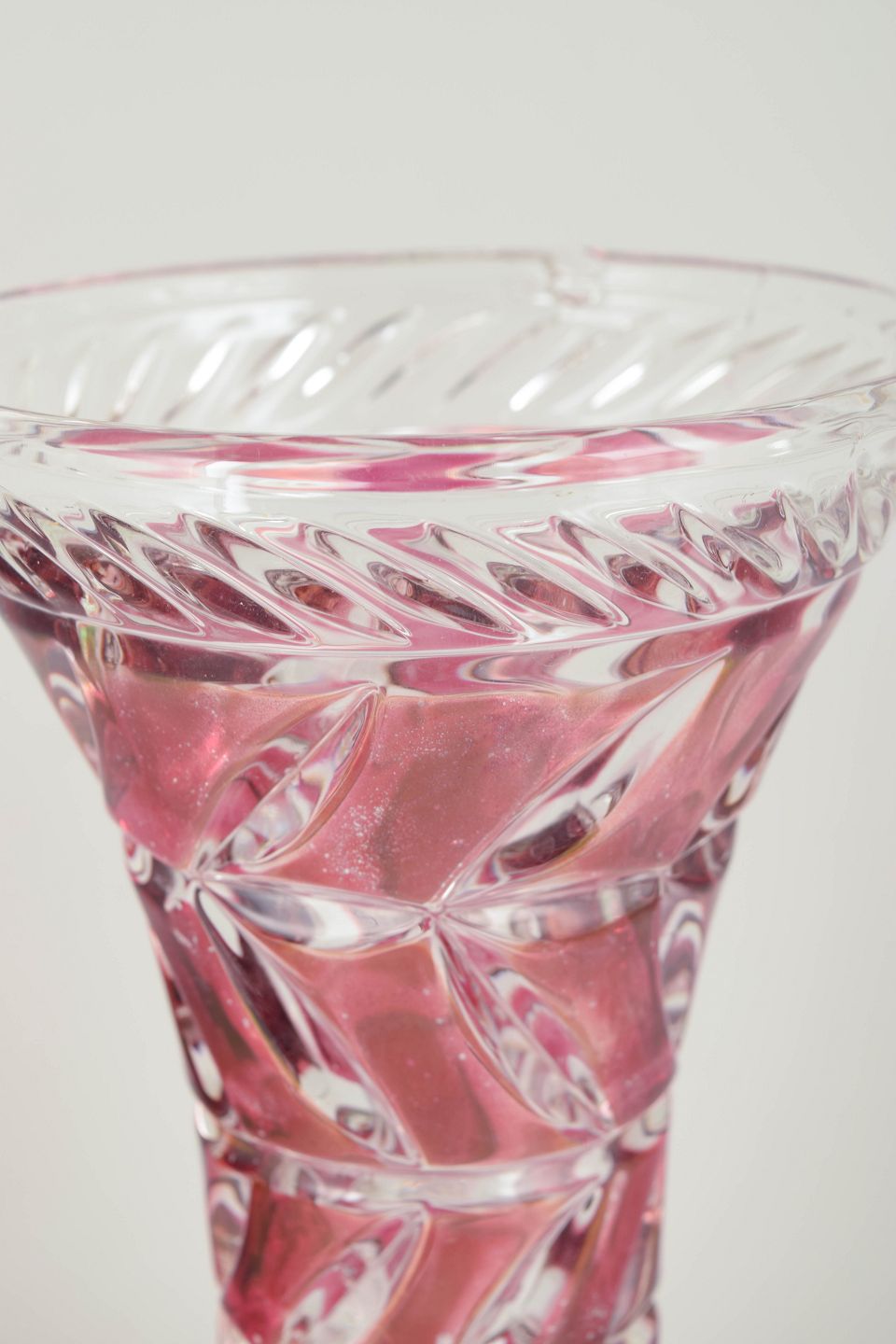 Presset og slebet krystal i klart og rosa tonet glas med spiralformet og geometrisk slebet dekor.