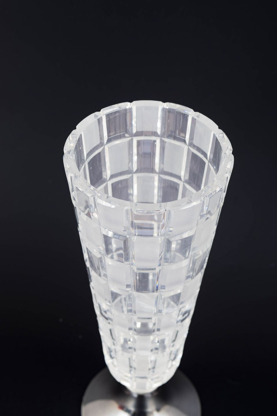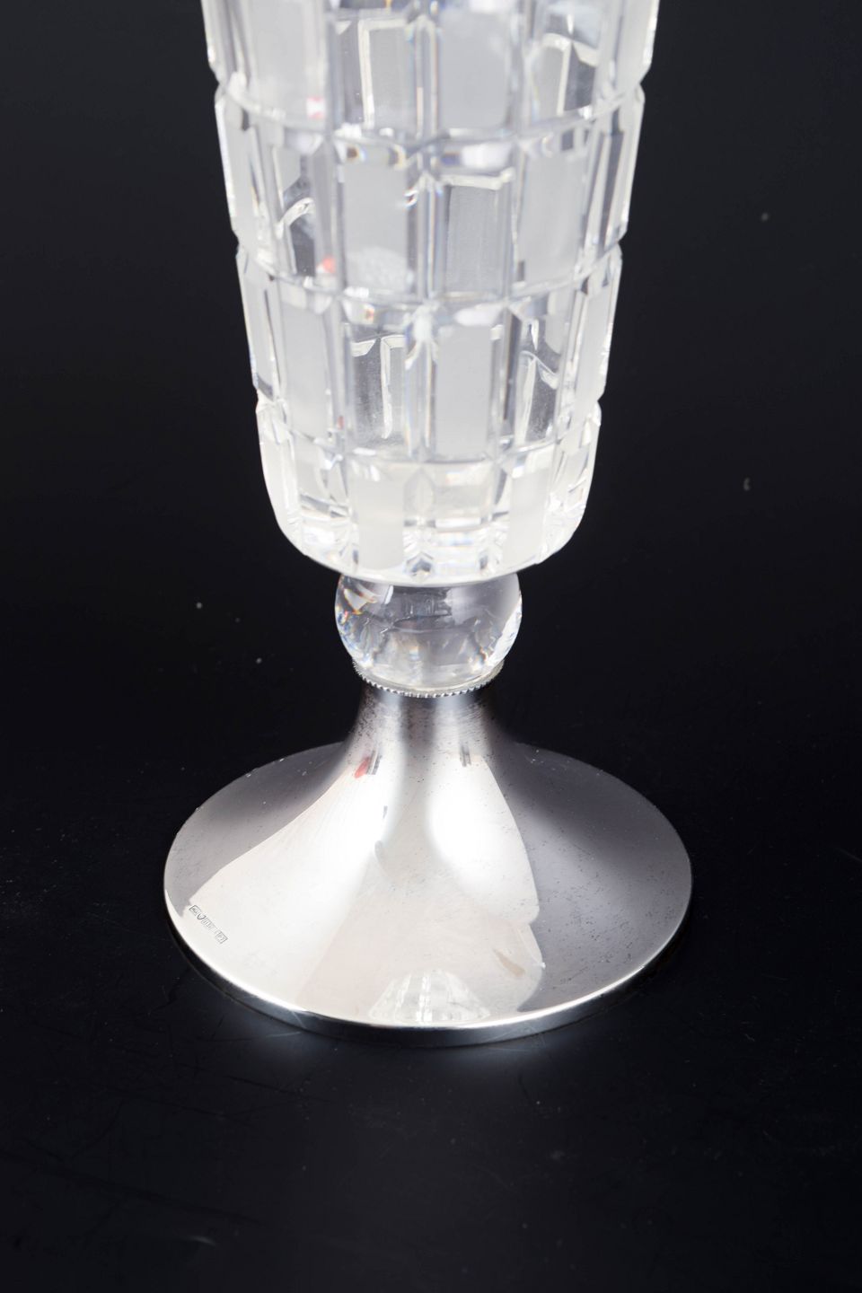 Modernistisk vase i slebet krystal med geometrisk mønster og fod i 813 sølv. Designet fremstår med klar, arkitektonisk struktur typisk for finsk glasdesign fra perioden.