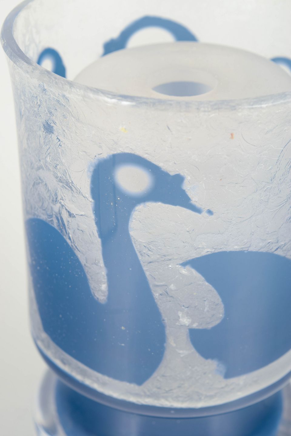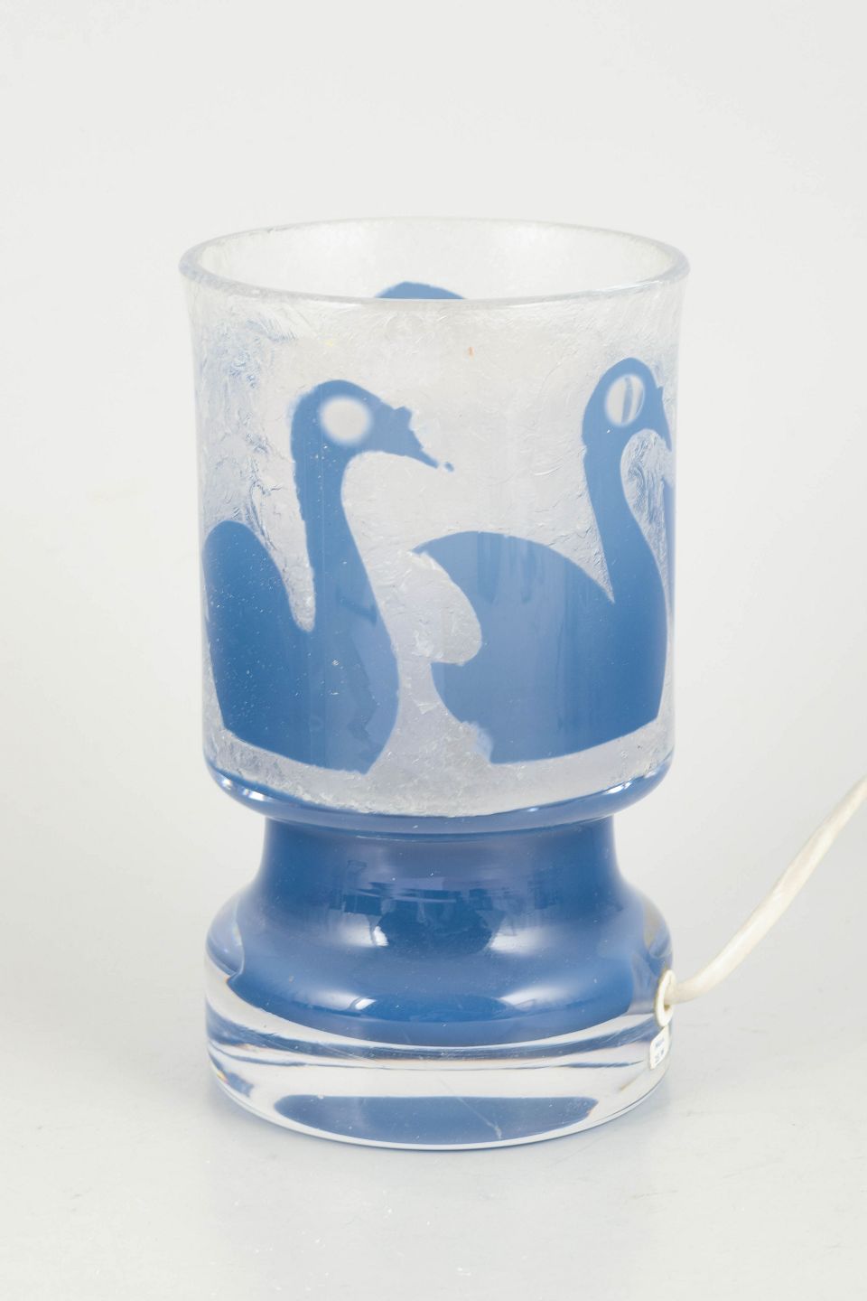 Decorative art glass table lamp with a frosted surface and blue swan motif, mounted on a clear and blue glass base. Signed underneath.