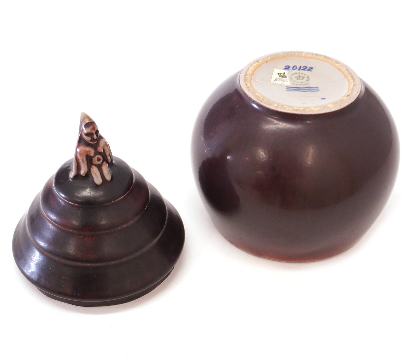 Bode Willumsen lågkrukke i stentøj med lågknop i form af kvindelig figur. Signeret Bode Willumsen Royal Copenhagen 20122. H: 17,5cm