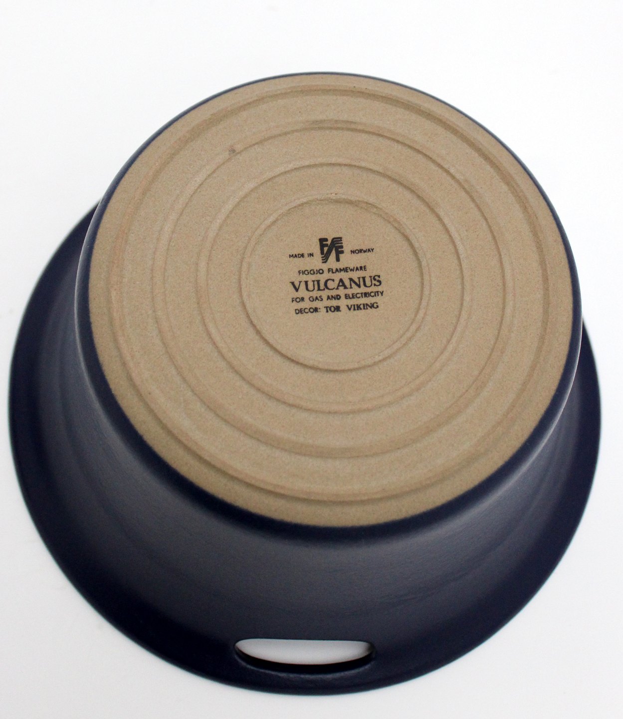 Text available in Danish: Figgjo Flameware, Norway, Tor Viking, Vulcanus, Ildfast skål eller gryde med låg og hanke. For gas and electricity. Højde 11,5 cm. Diameter 19,5 cm. Flot stand, mint condition. Pris: 375 kr. stk. Lager: 1