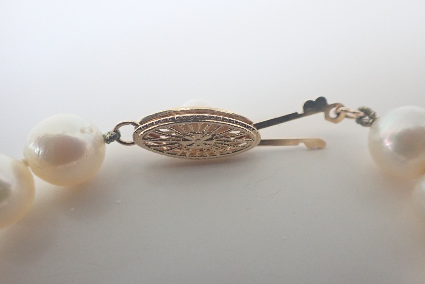 Perlekæde med lige store saltvandskulturperler og med guldlås.
