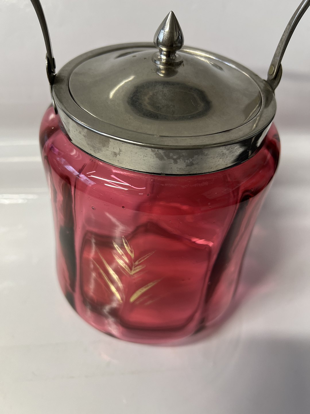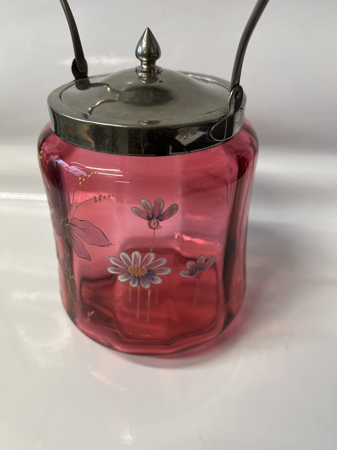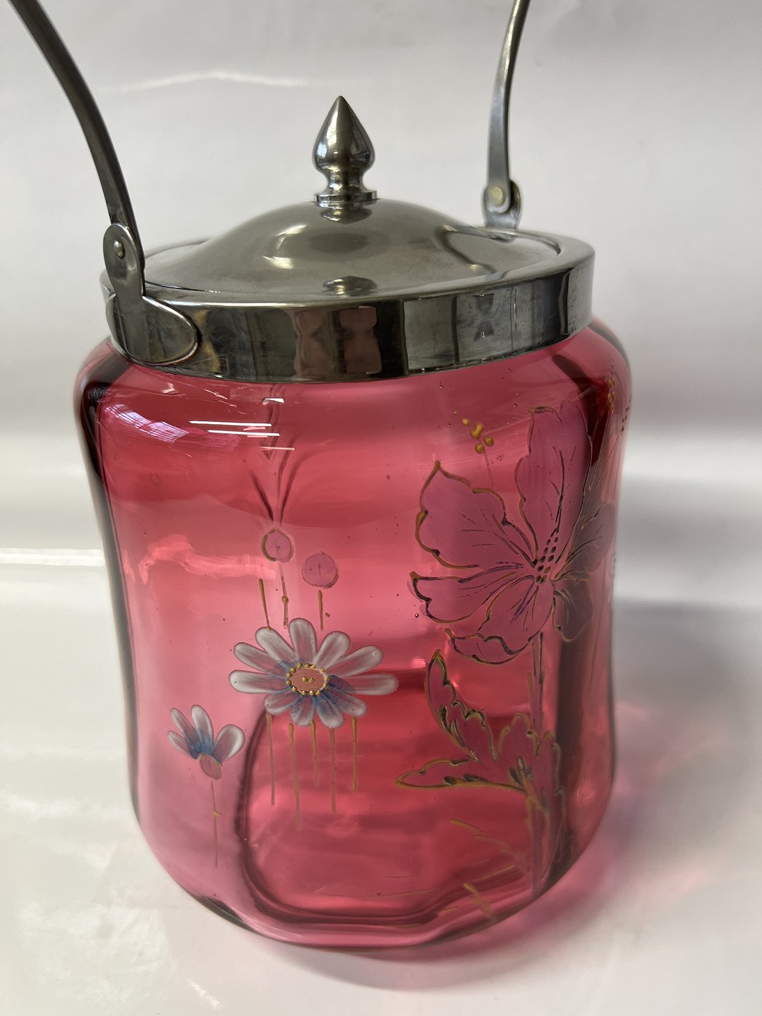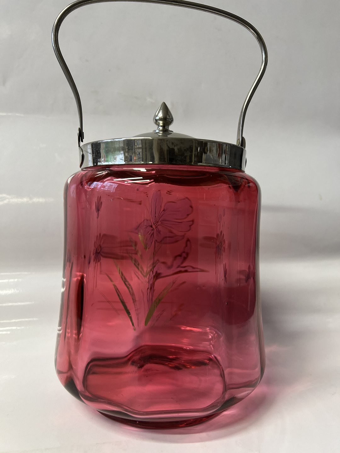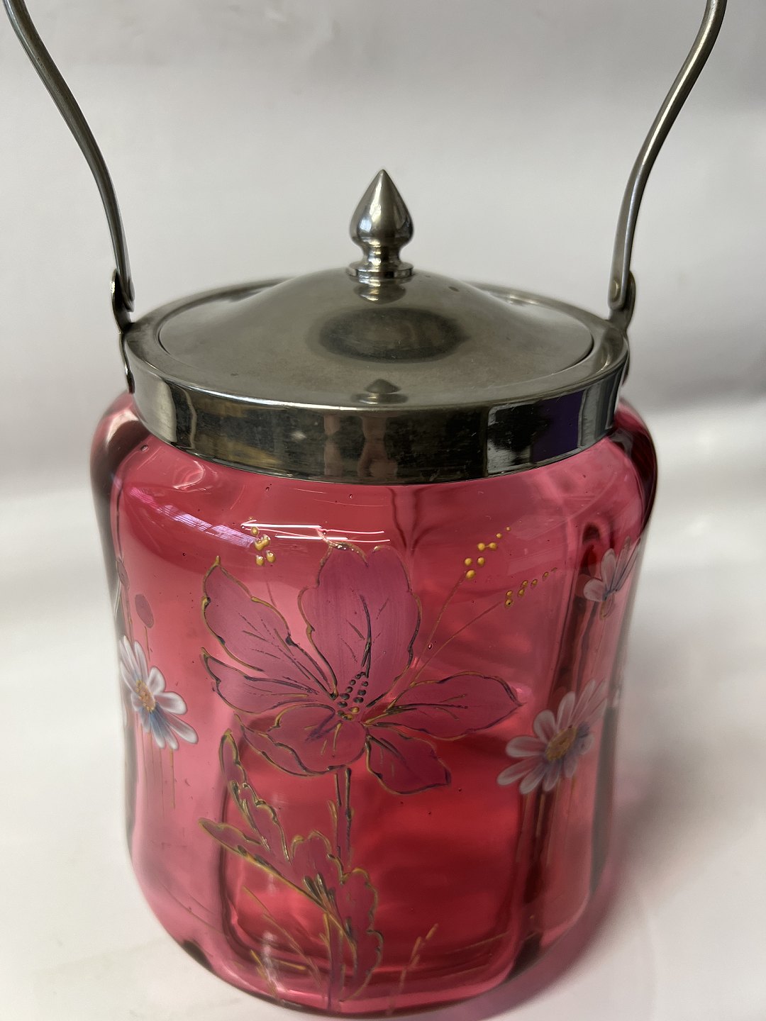 Kiksespand i Rød Glas med blomstermotiv.