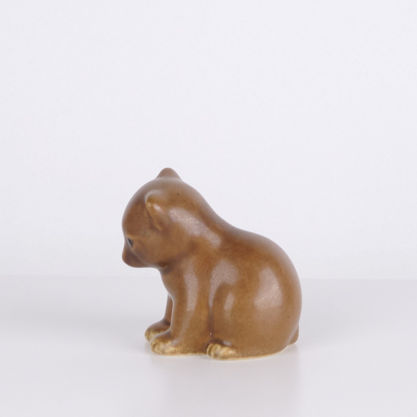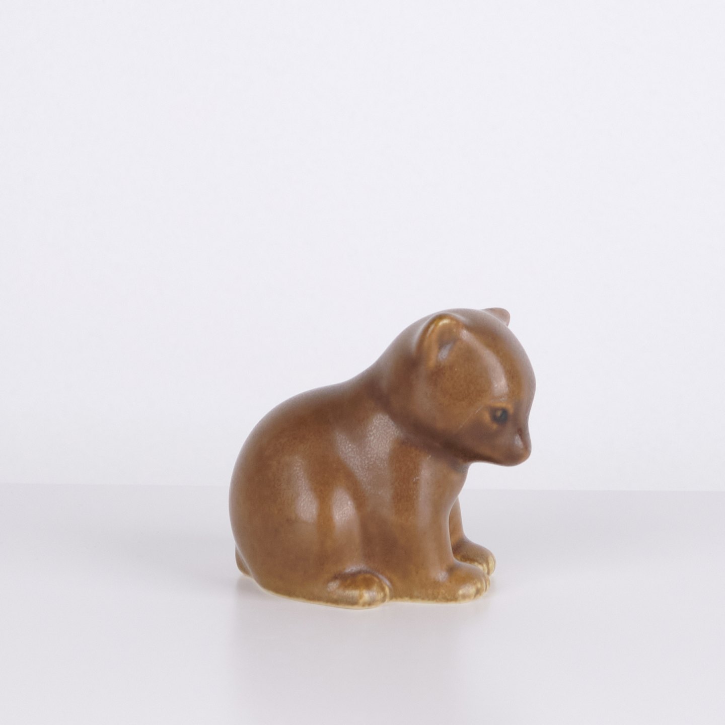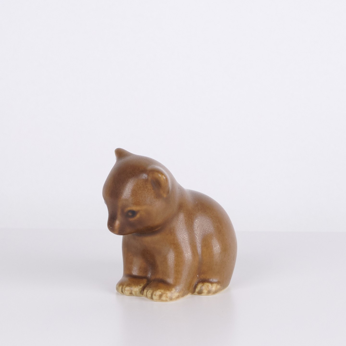 Bjørnefigur af Knud Basse udført i lys brun glaseret keramik. Figuren viser siddende bjørn med sænket hoved, markerede poter og bløde organiske former. En klassisk mindre model fra Knud Basses serie af dyrefigurer fremstillet i Danmark i 1960’erne.