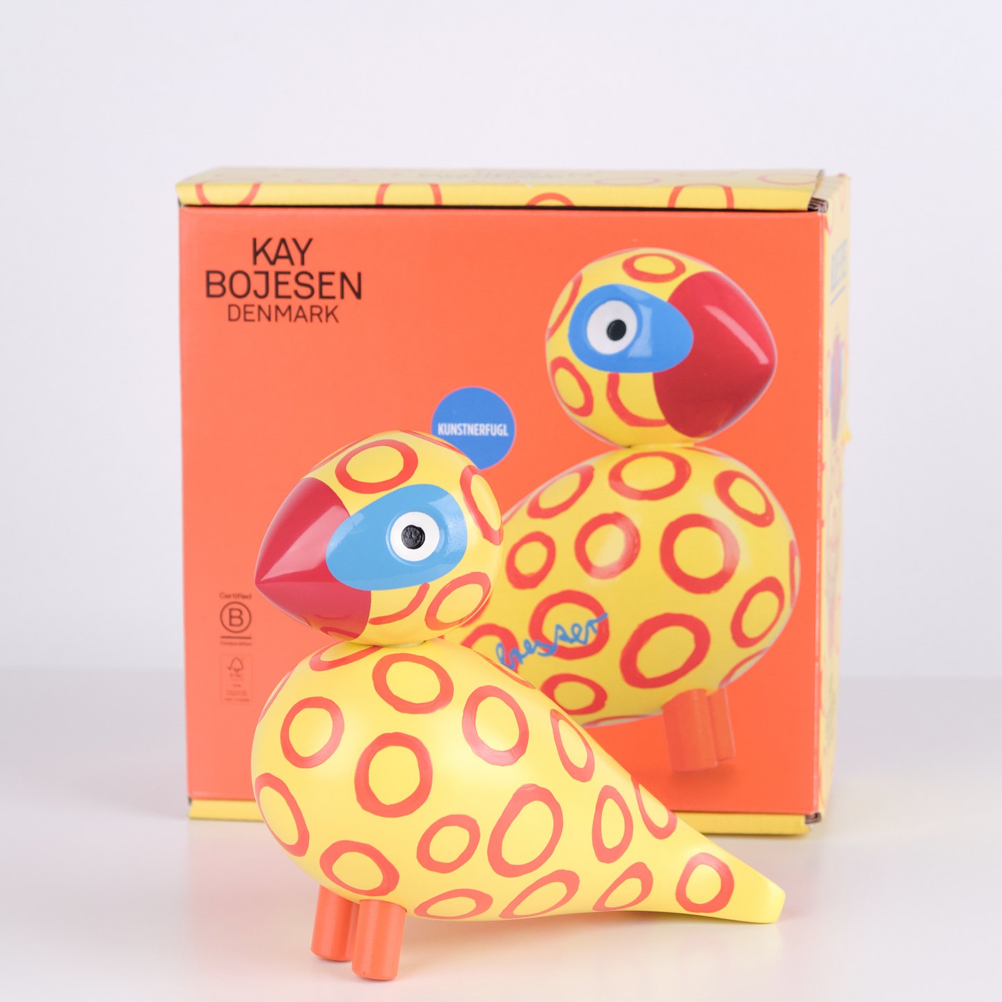 Sangfugl Blue Eyes skabt som samarbejde mellem Kay Bojesen og Leif Sylvester. Figuren er udført i malet træ med flerfarvet dekoration og Blue Eyes motiv. Serien bygger videre på Kay Bojesens kendte træfigurer og kombinerer klassisk dansk design med Leif Sylvesters farverige univers. Et dekorativt samleobjekt og et fint eksempel på moderne fortolkning af dansk designarv.