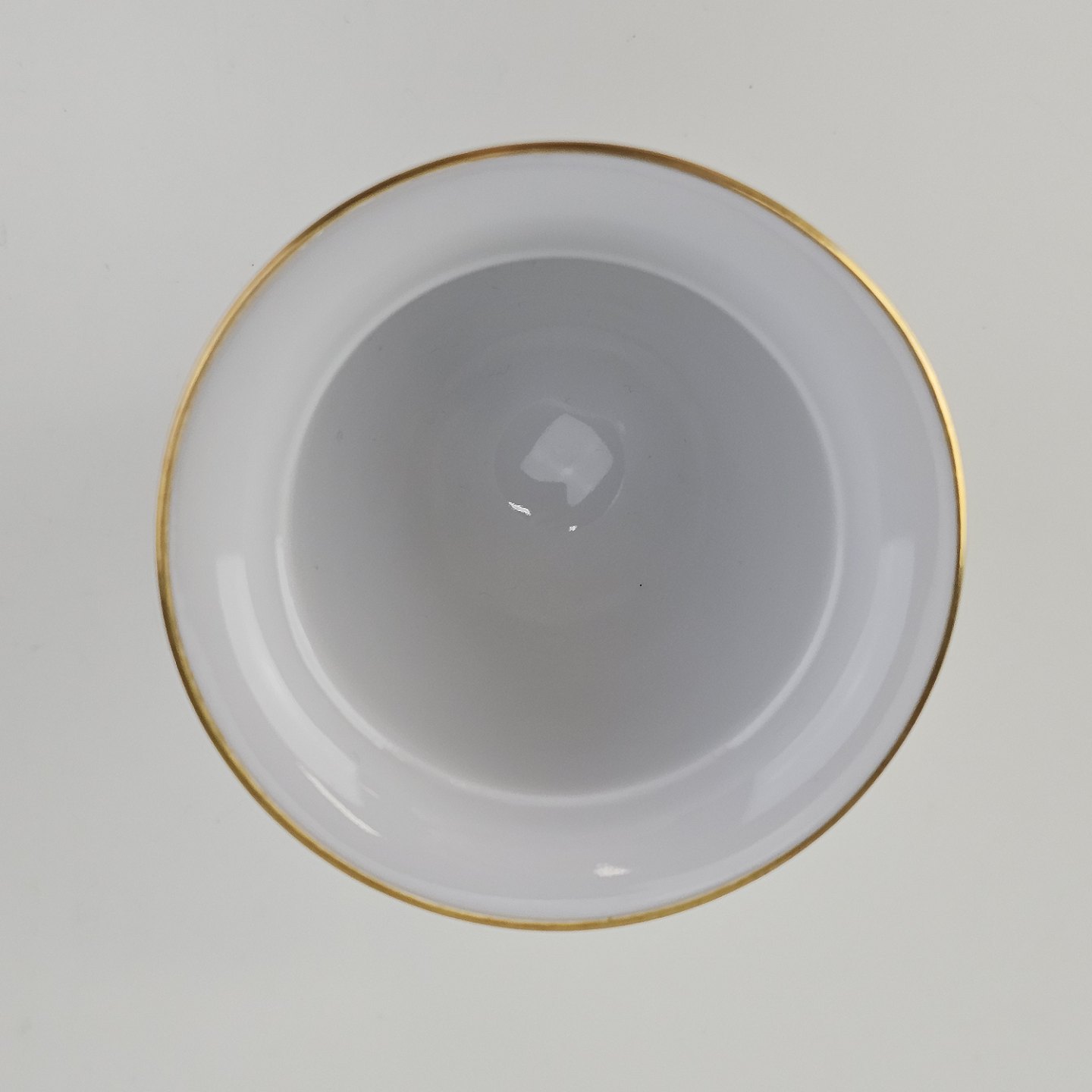 Bæger i hvidt porcelæn med guldkant og motiv af påskelilje