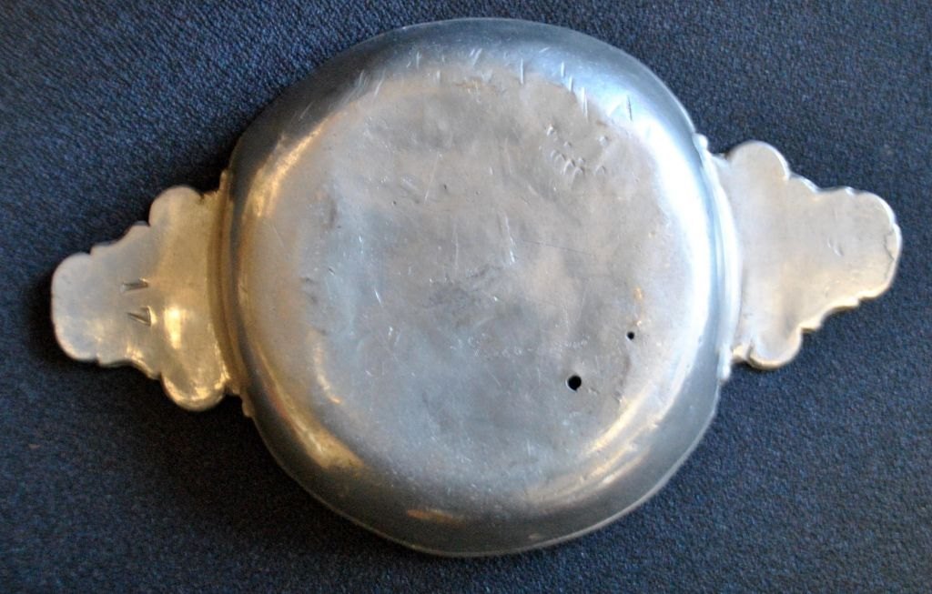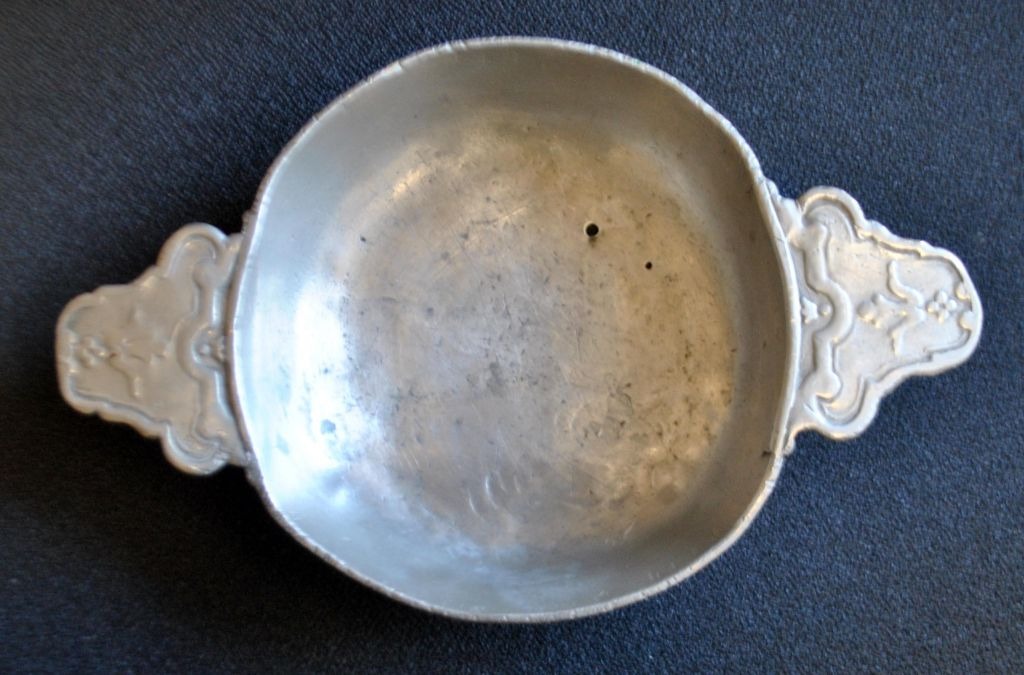 Barok øre skål i tin. 18. årh. Danmark. Madskål. Med glatte, buede sider. Støvte ører med barokmønstre. På undersiden af det ene øre, stemplet: 17. Dia: 16 cm. Længde med ører: 24,5 cm. H.: 4 cm. Ingen mesterstempler.