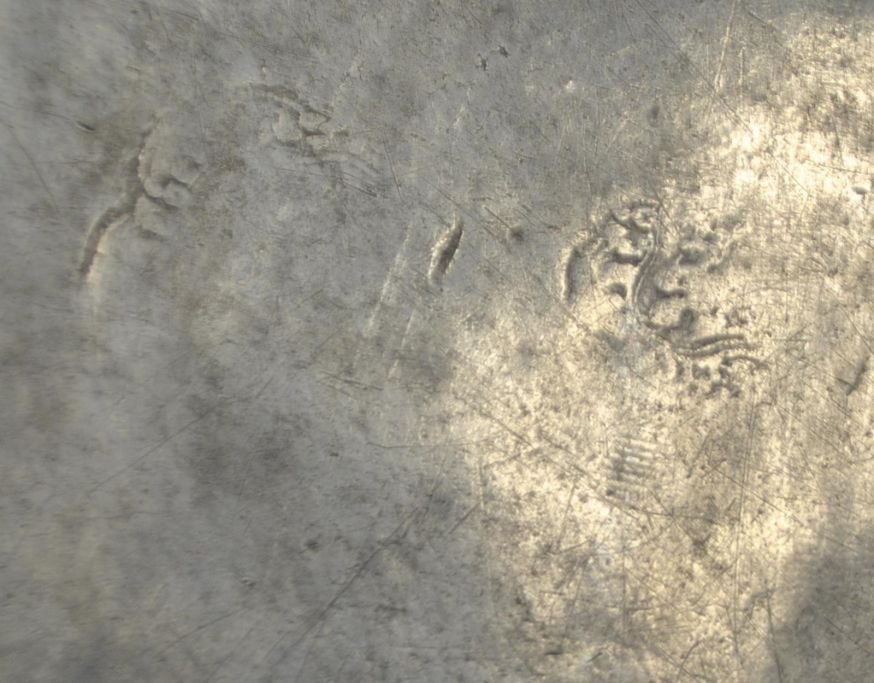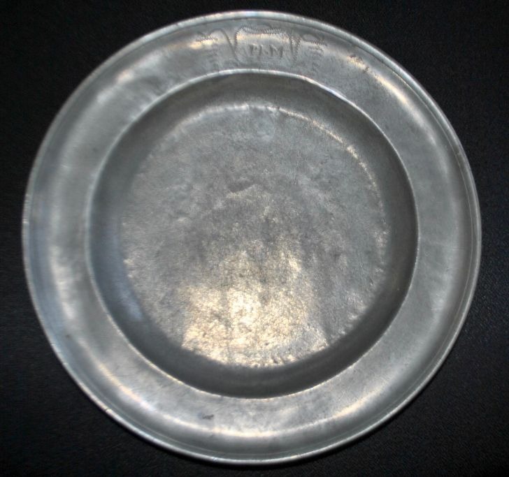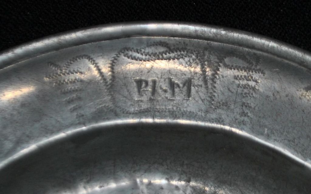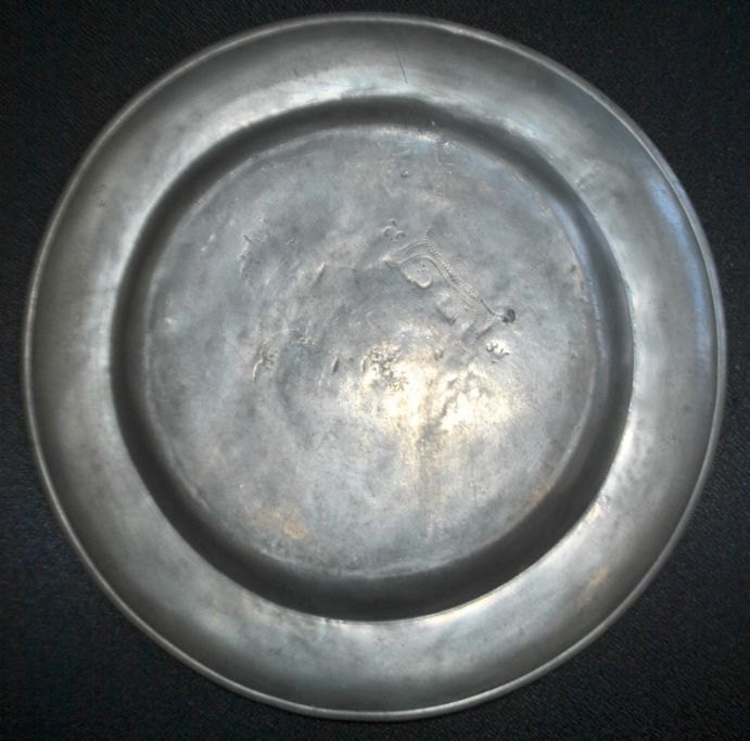 Tinfad, 18. årh. Med stempler og graveringer. Foran indgravering: PH.M og blomsterdekor. På undersiden: P. G 1832. Utydelige mesterstempler. Dia: 29 cm.