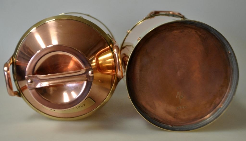 Par kobber mælkespande med messingbeslag, 1986-88, Danmark
