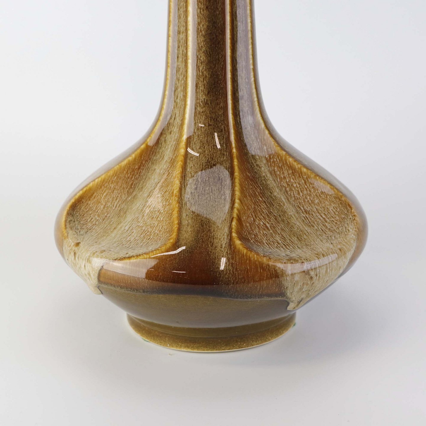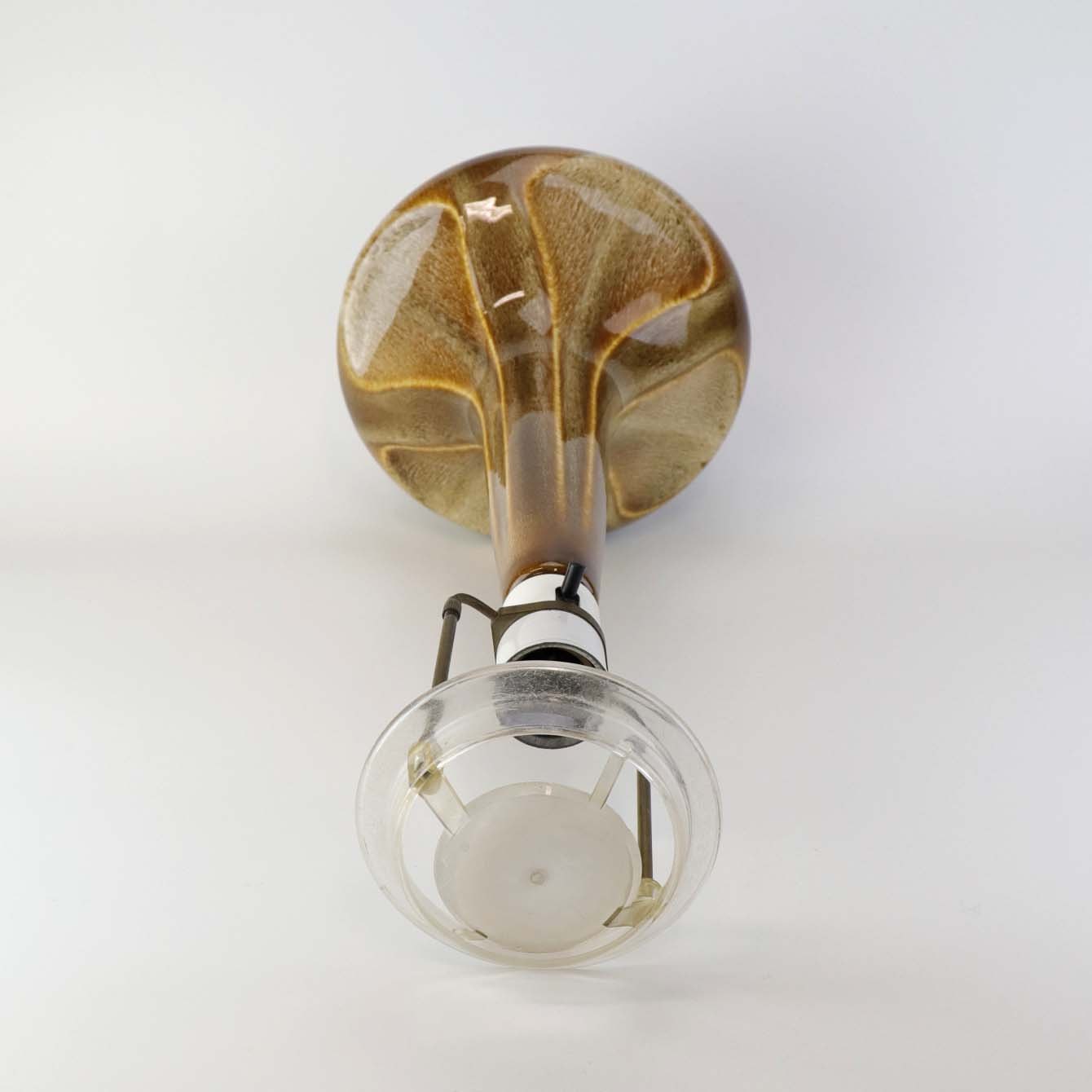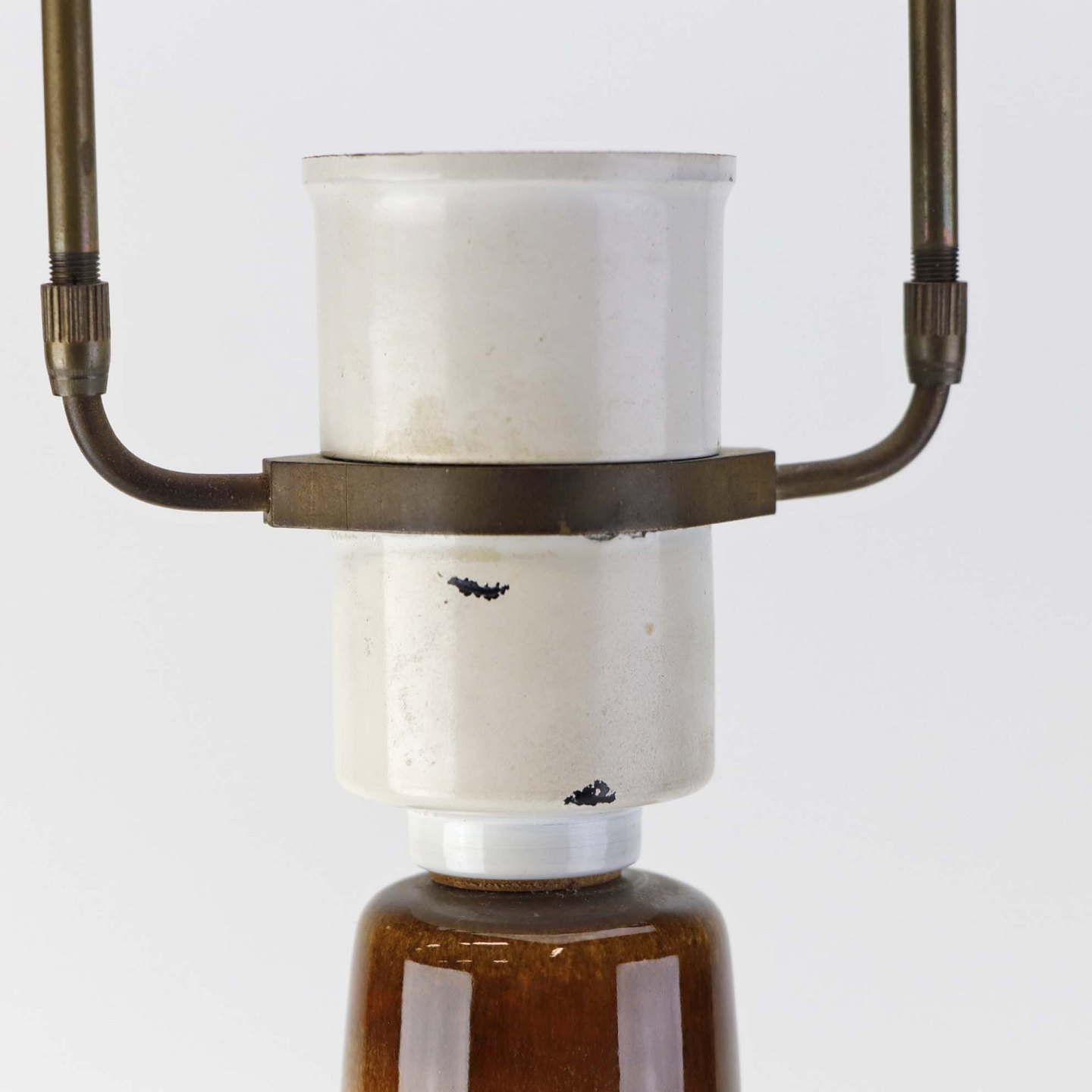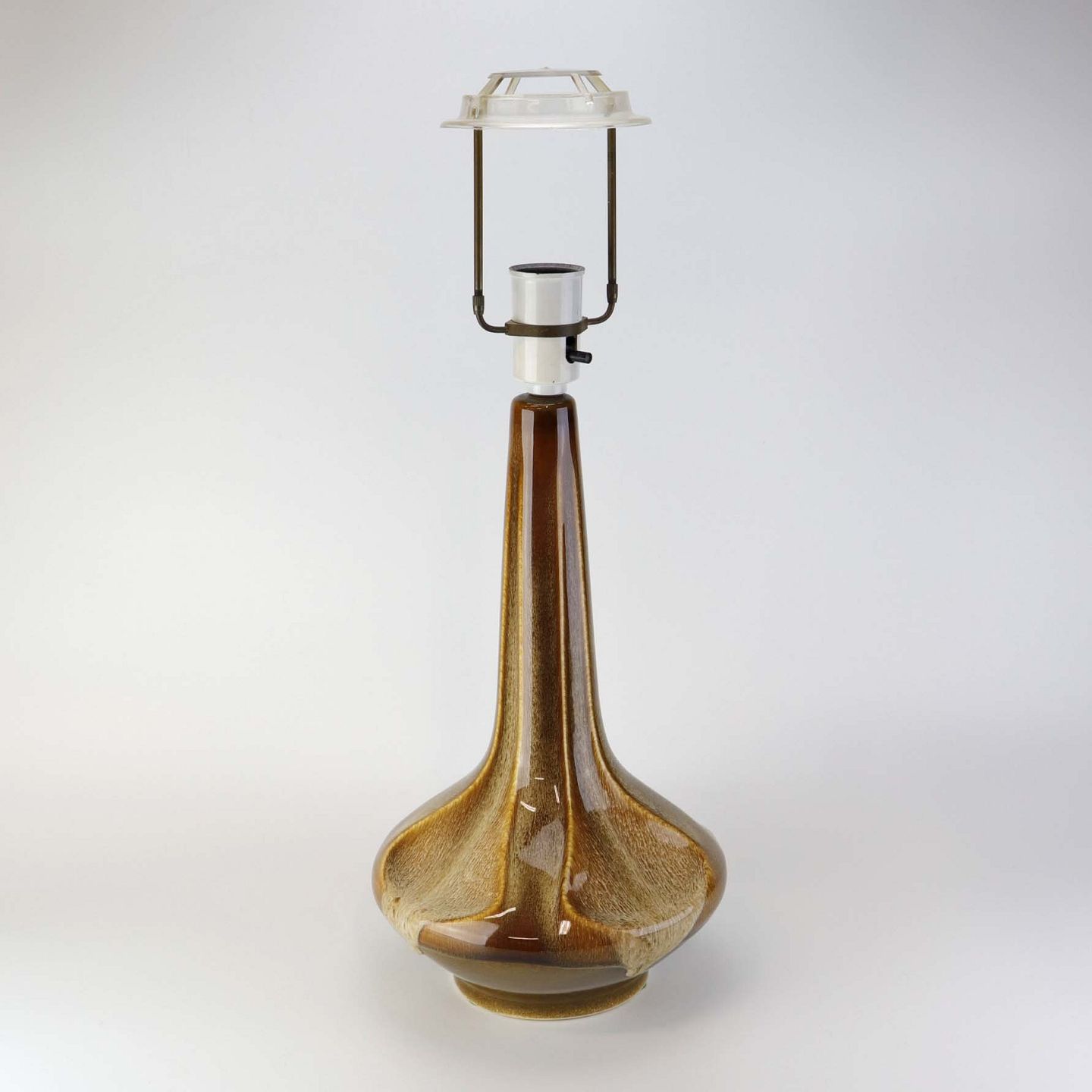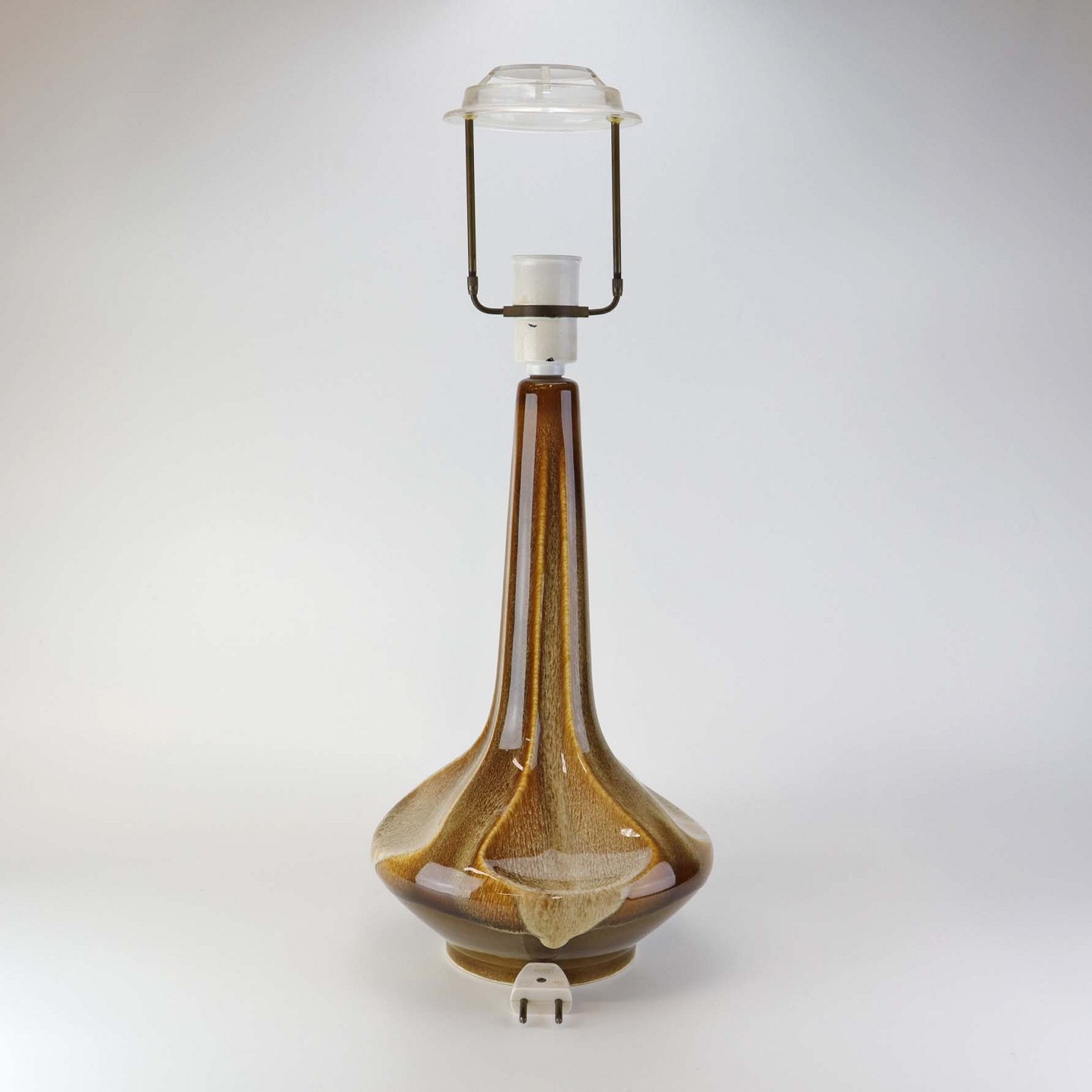 Lampefod i stentøj med harepelslignende glasur i brunlige nuancer. Ledningen ligger indeni foden. Nr. 1207