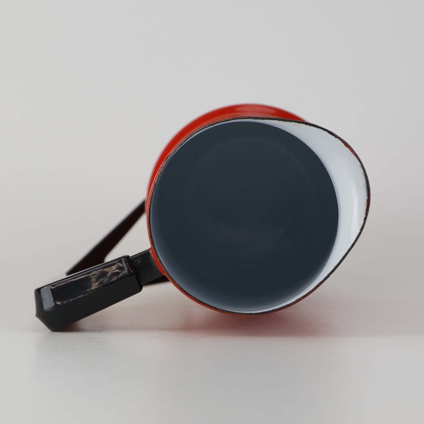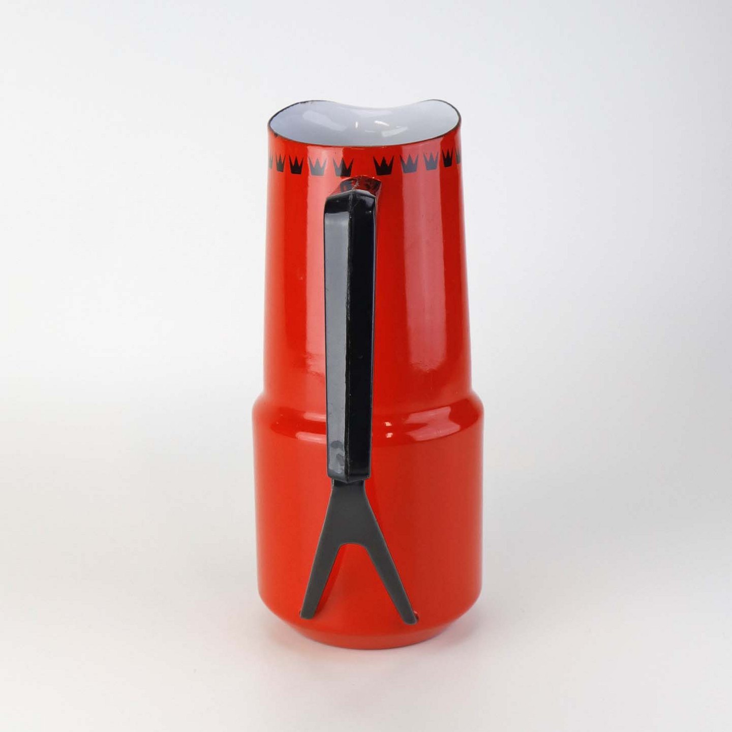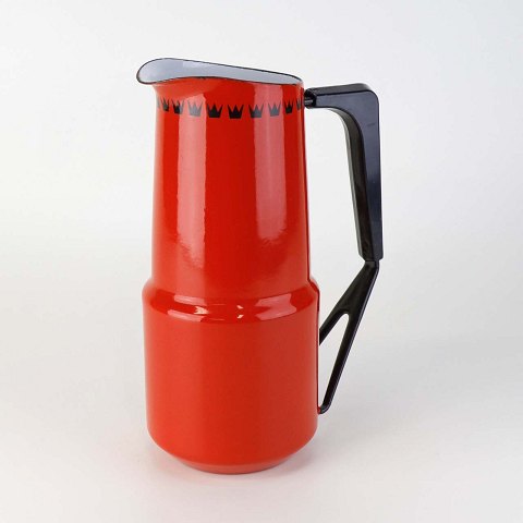 Dankok kande i metal belagt med rød, hvid og sort emalje og mønster af sorter tretakket kroner. Del af hanken er omgivet af sort plast.