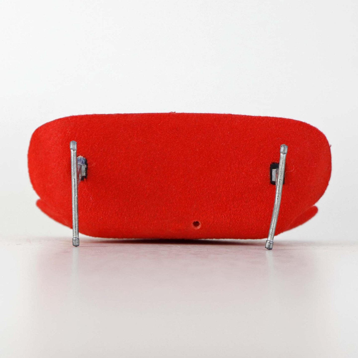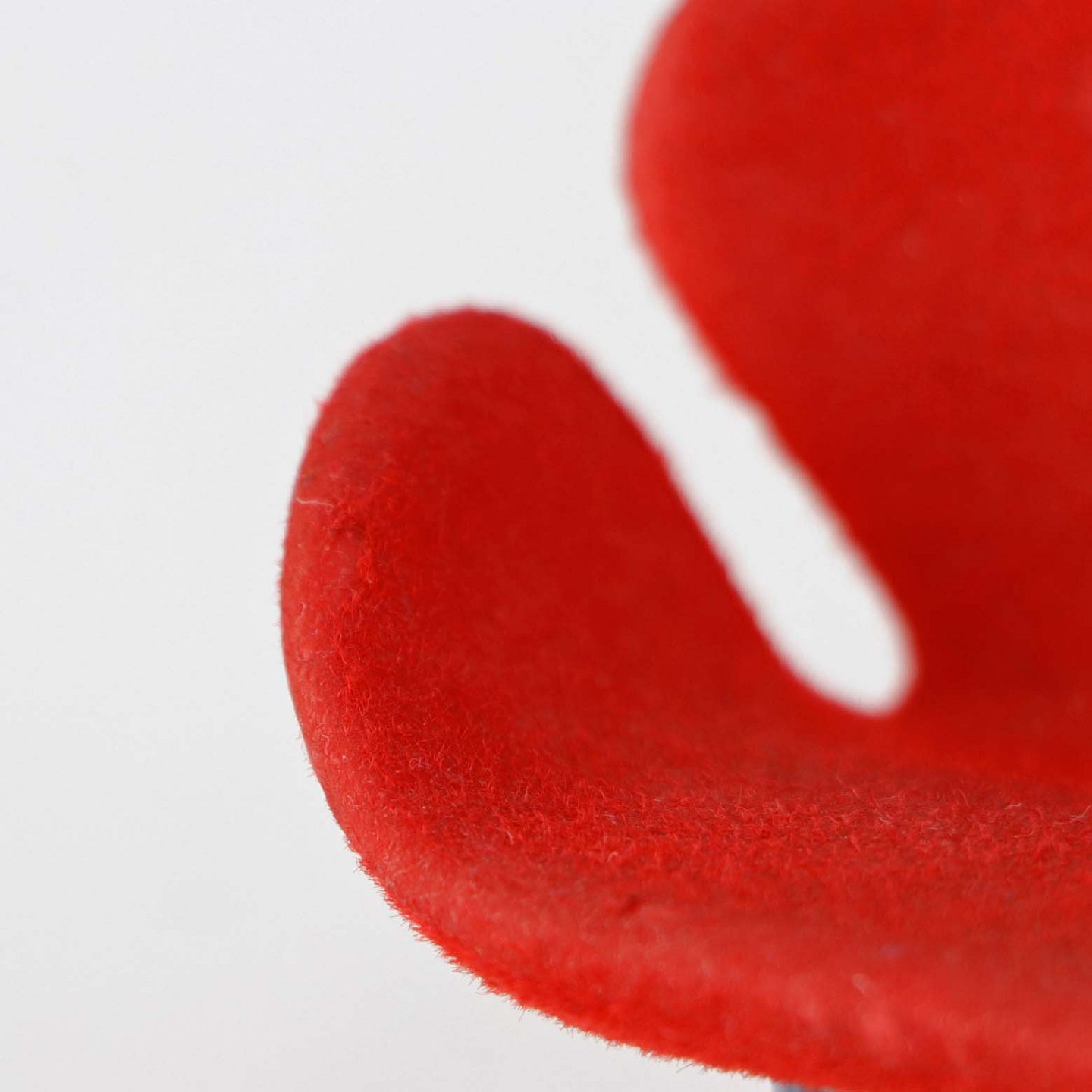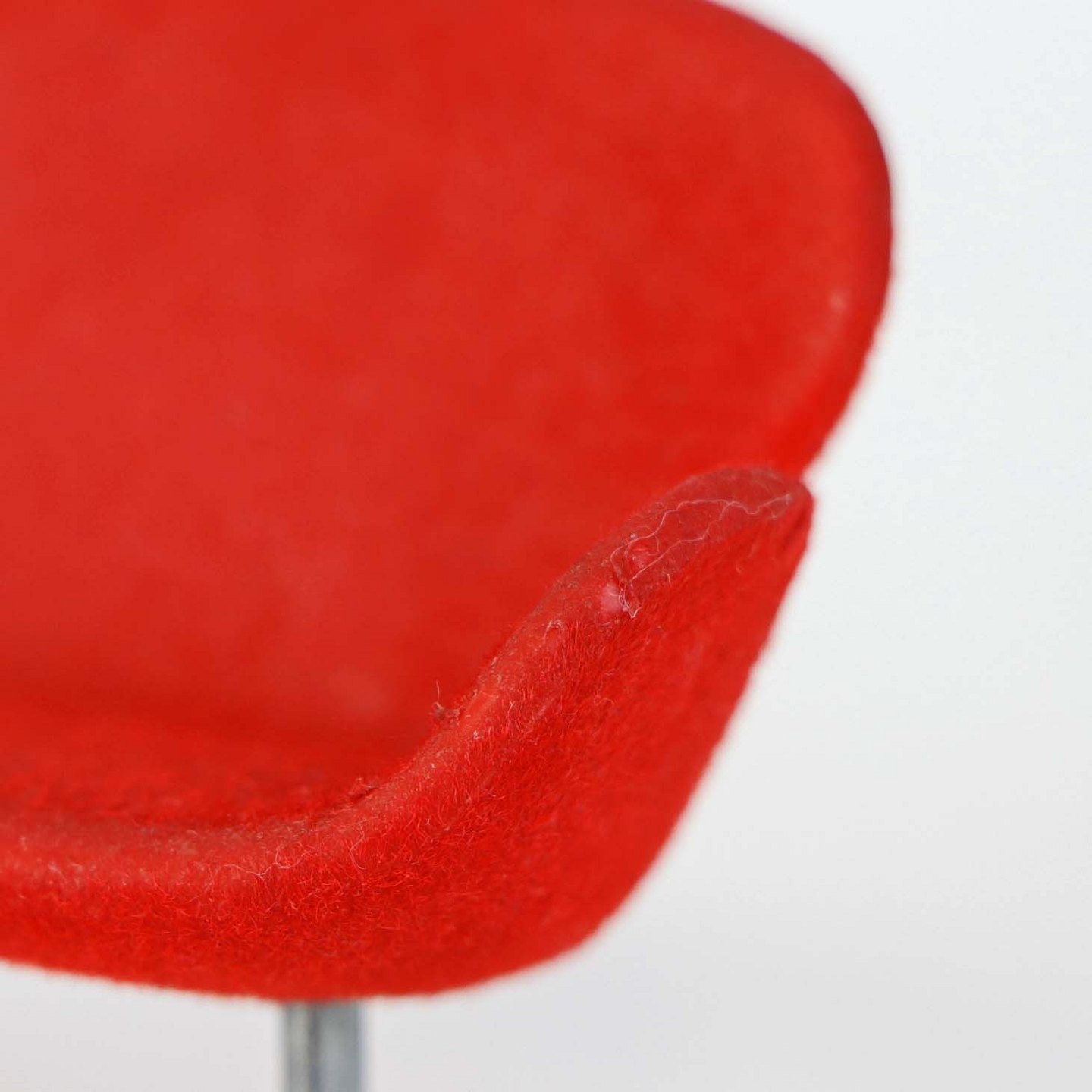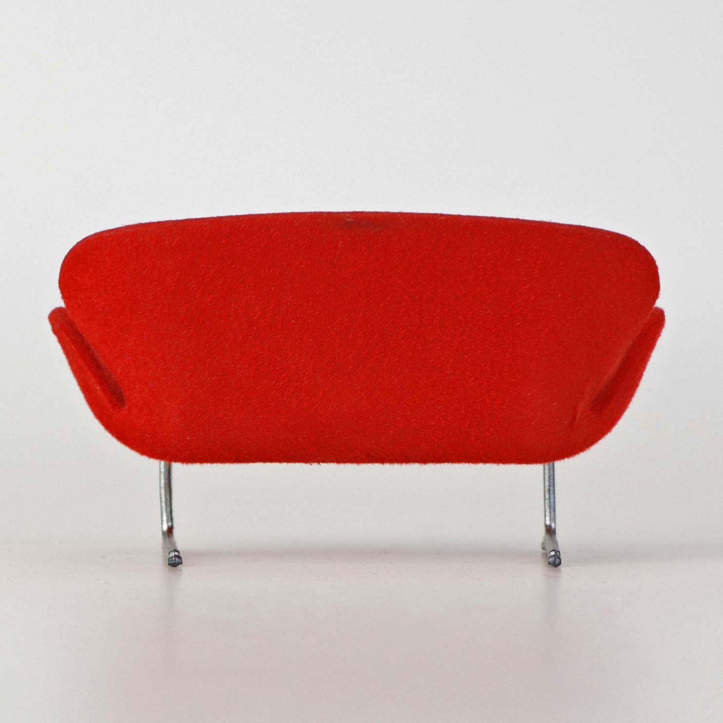 Miniature designermøbel til dukkehus med model af Arne Jacobsen's Svanesofa i rød farve med stel i metal.