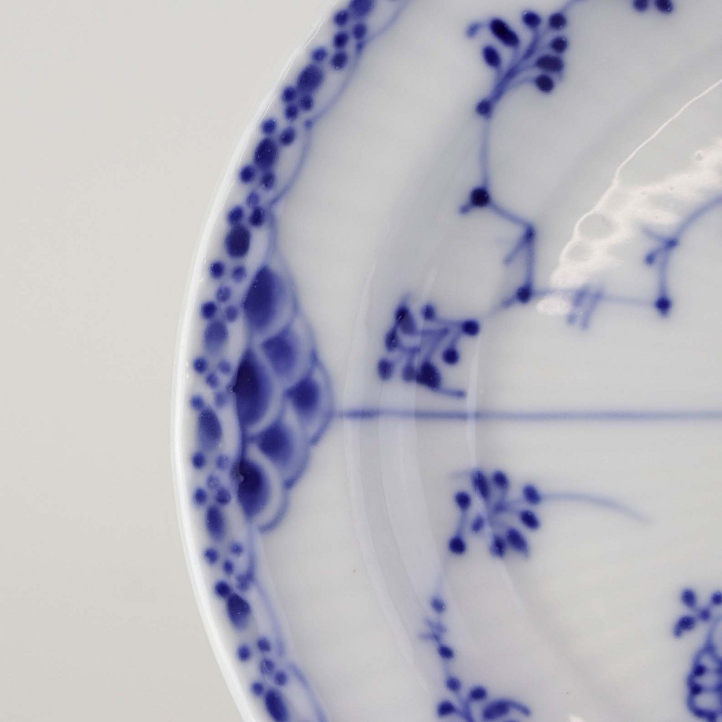 Musselmalet halvblonde er riflet hvidt porcelæn med dekoration af blå ranker og en kant med blonder.