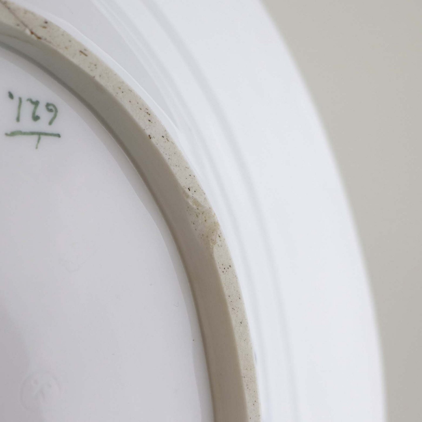 Musselmalet halvblonde er riflet hvidt porcelæn med dekoration af blå ranker og en kant med blonder.