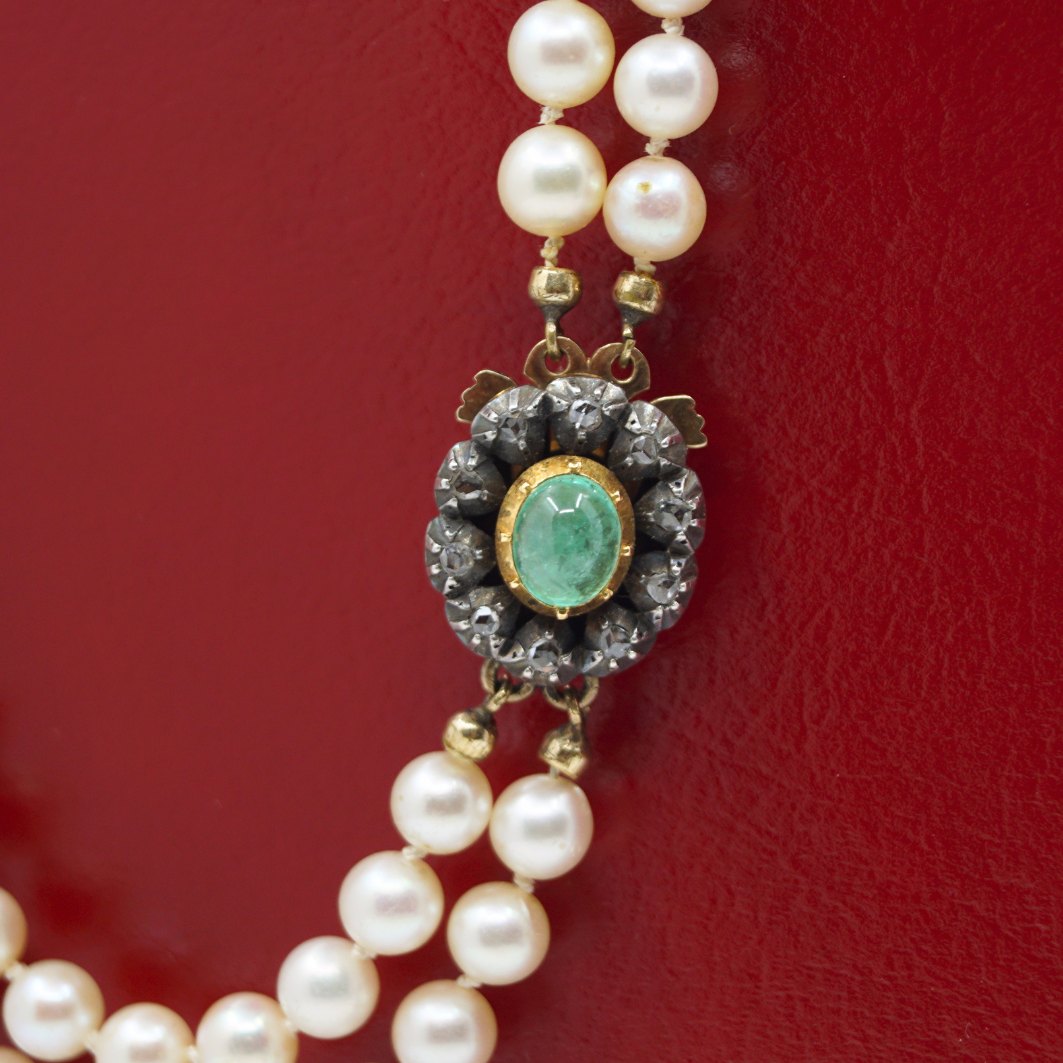 Dobbeltradet perlekæde trukket med knuder mellem perlerne. Smykkelås af 14 kt. hvidguld og guld, prydet med diamanter og smaragd.