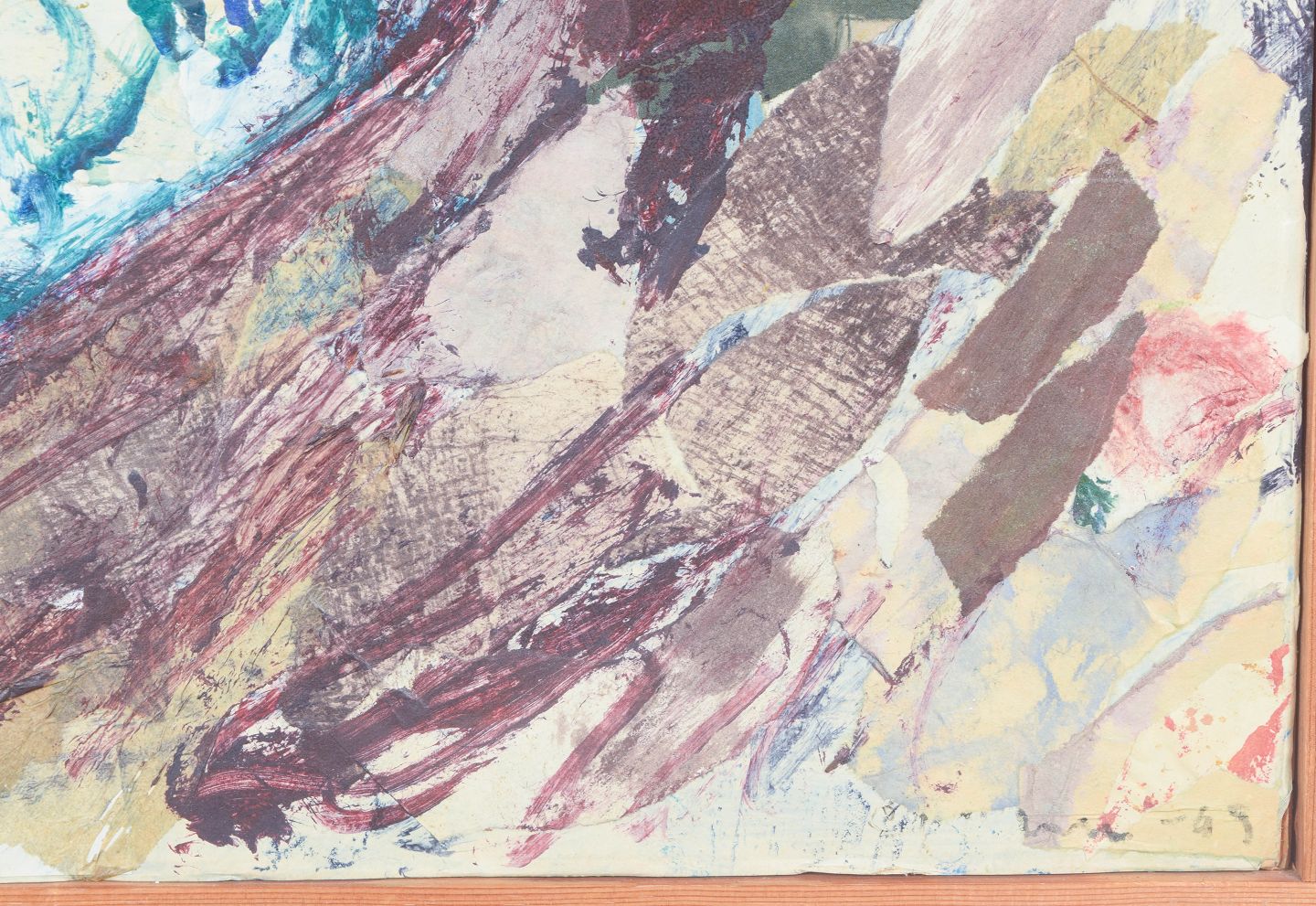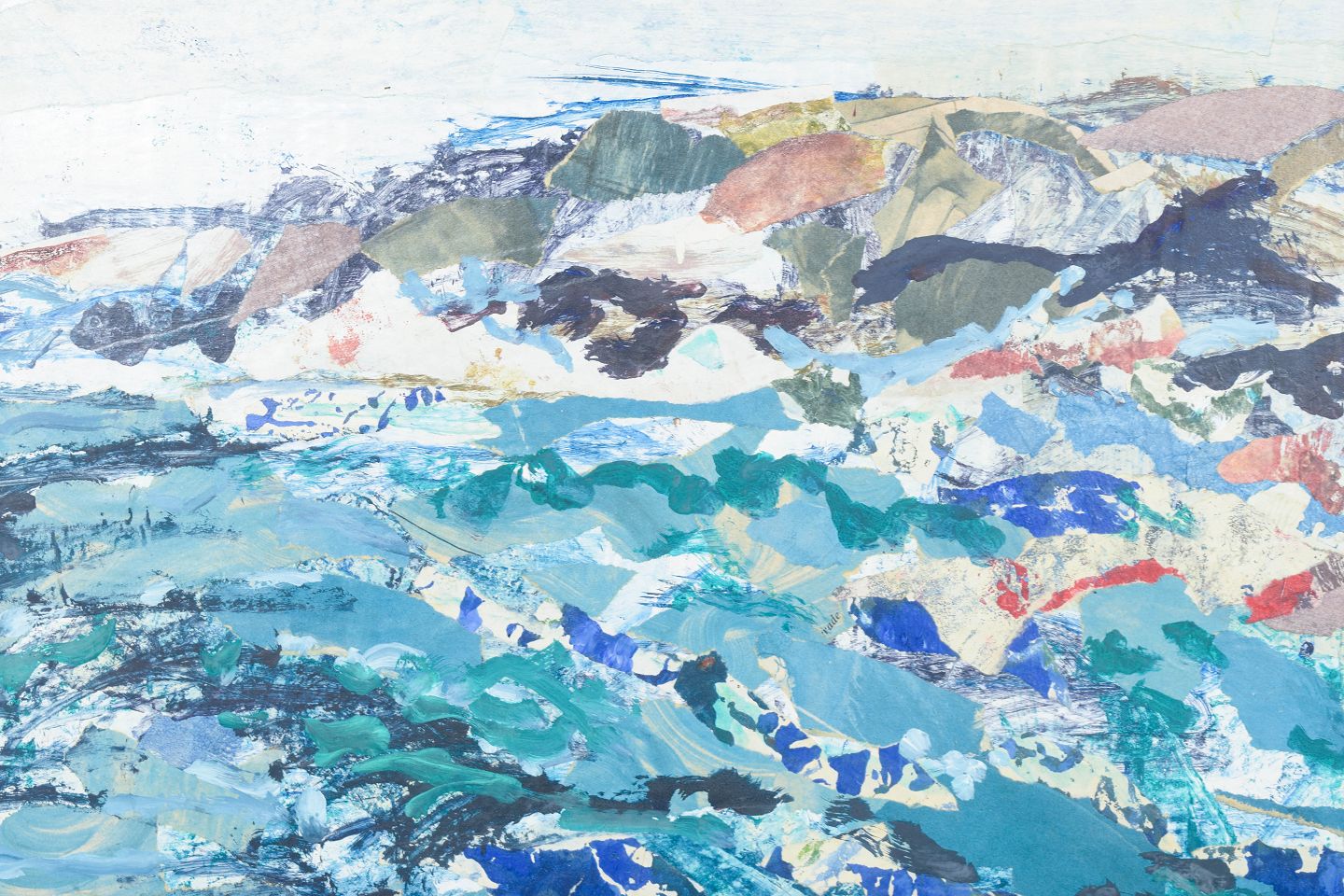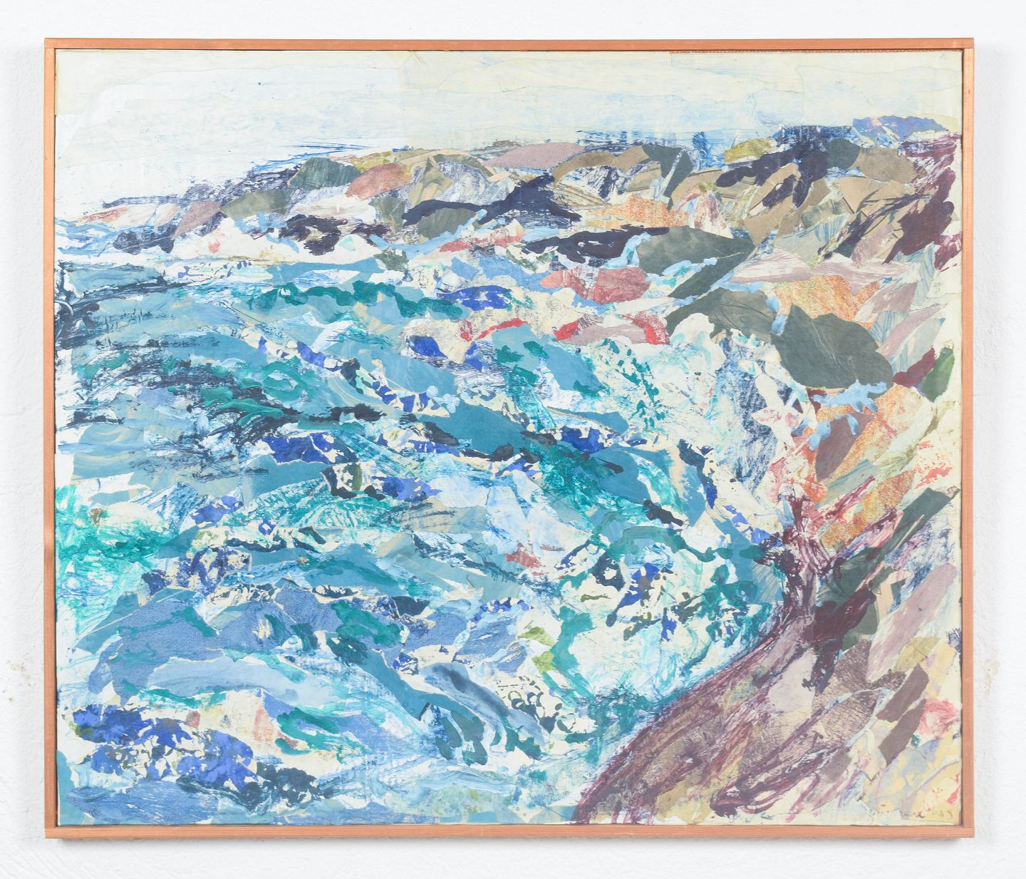 Ekspressivt kystmotiv fra den svenske skærgård med dynamiske penselstrøg og lagdelte farvefelter i blå, grønne og jordede nuancer. Kompositionen er udført i mixed media på plade og fremstår signeret og dateret 1969.