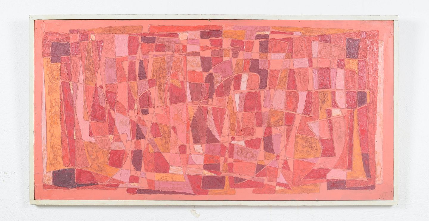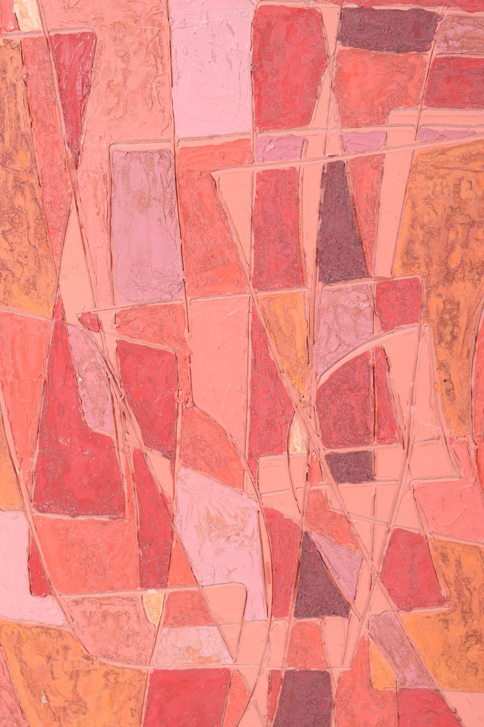 Abstrakt ekspressiv komposition opbygget i et mosaiklignende formsprog med varme røde og rosa nuancer, hvor flader og rytmiske opdelinger danner et dynamisk og dekorativt helhedsindtryk. Signeret VT.