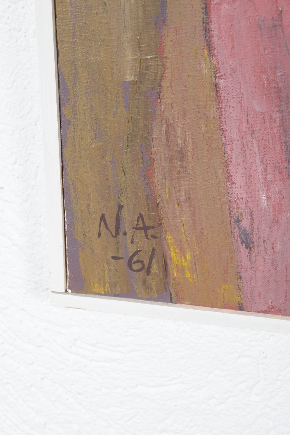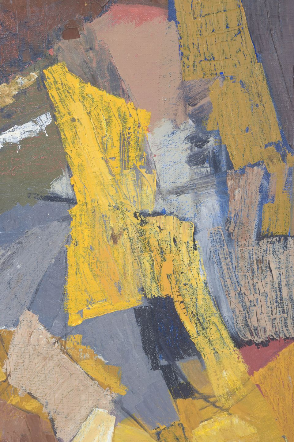Abstrakt komposition med kraftfuld pensel- og paletknivsføring i jordfarver og gule nuancer. Titel : “från Hven – Backafallen”, signeret og dateret 1961.