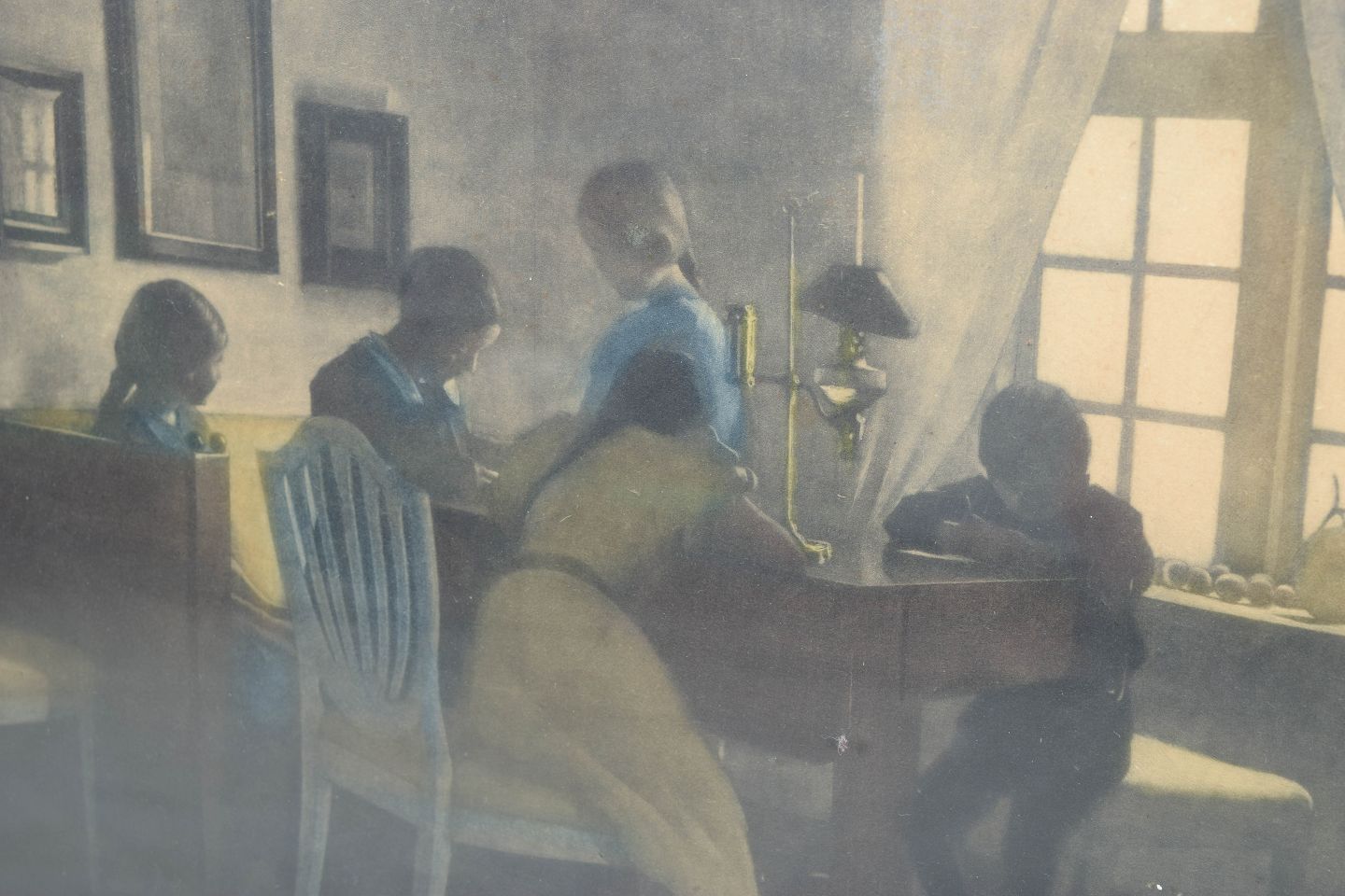 Stille interiørscene med figurer omkring et bord i dæmpet lys, udført som mezzotinte i Ilsteds karakteristiske tonale og atmosfæriske stil. Signeret i blyant.