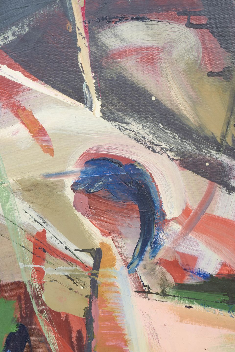 Ekspressiv modernistisk komposition med dynamiske penselstrøg og geometrisk-opløste former i en levende farvepalet. Motivets struktur antyder arkitektoniske elementer og rumlige spændinger, udført med en fri og gestisk tilgang. Olie på lærred, usigneret.