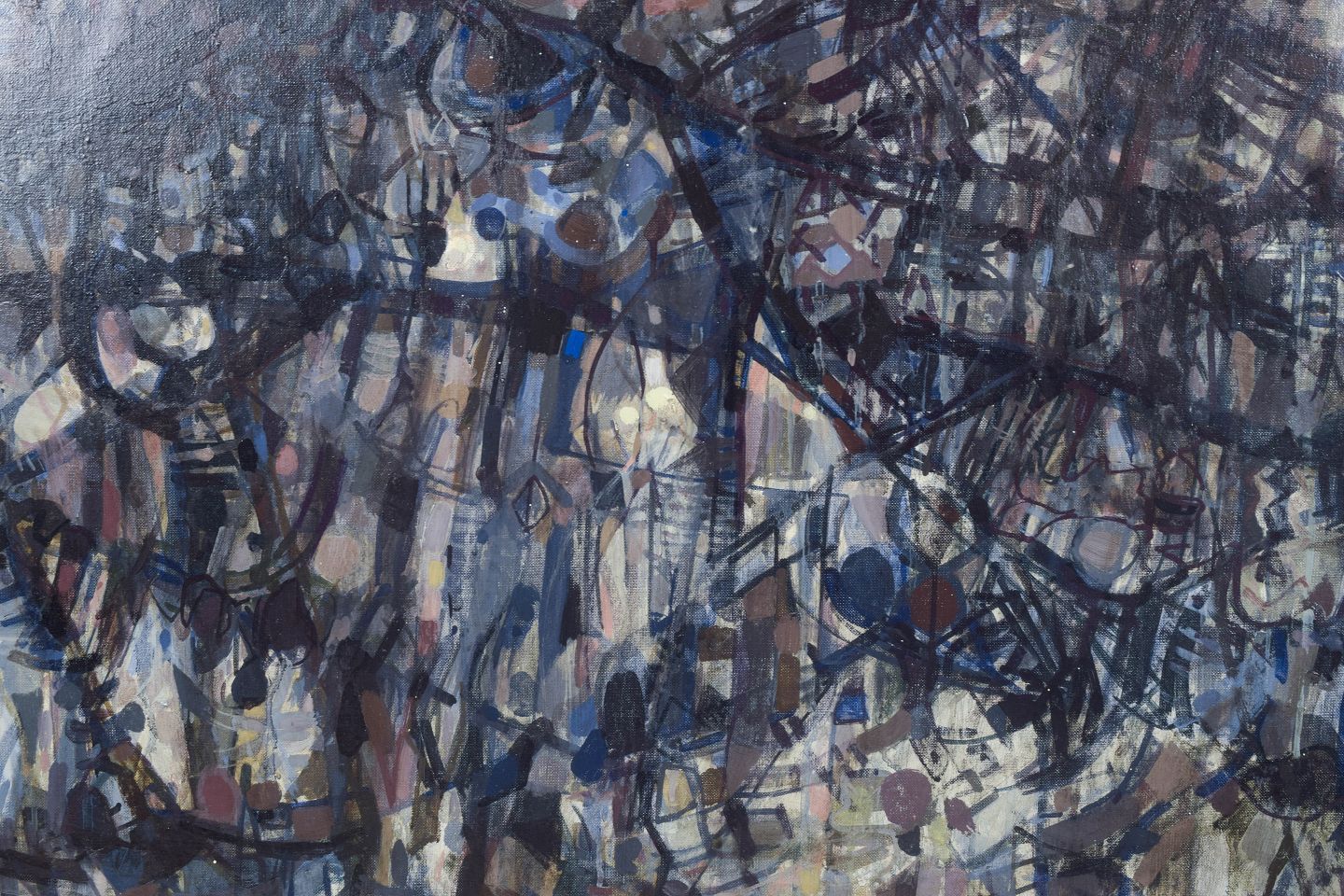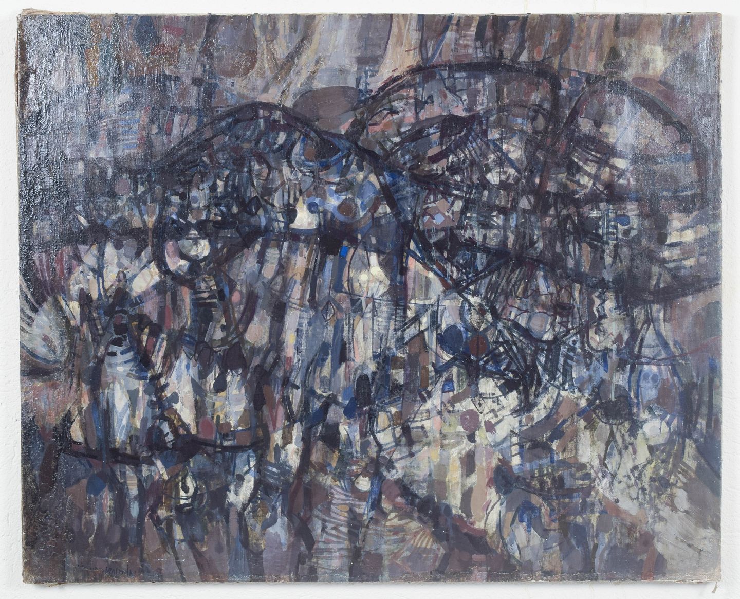 Abstrakt komposition udført i en ekspressiv modernistisk stil med lagdelte penselstrøg og komplekse lineære strukturer i dæmpede blå, grå og jordfarvede nuancer. Kompositionen fremstår dynamisk med en næsten figurativ rytme i det abstrakte formsprog. Olie på lærred, signeret og dateret 1967.