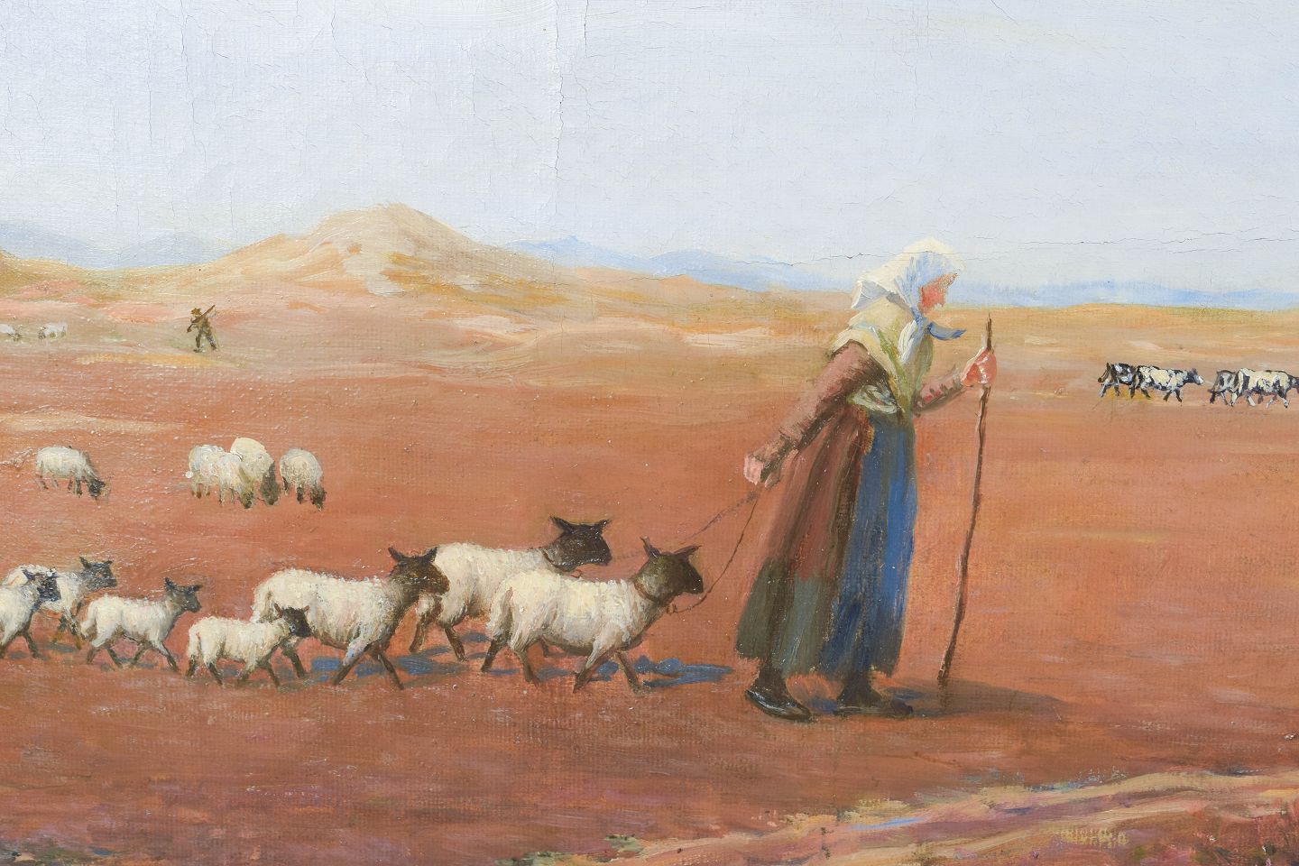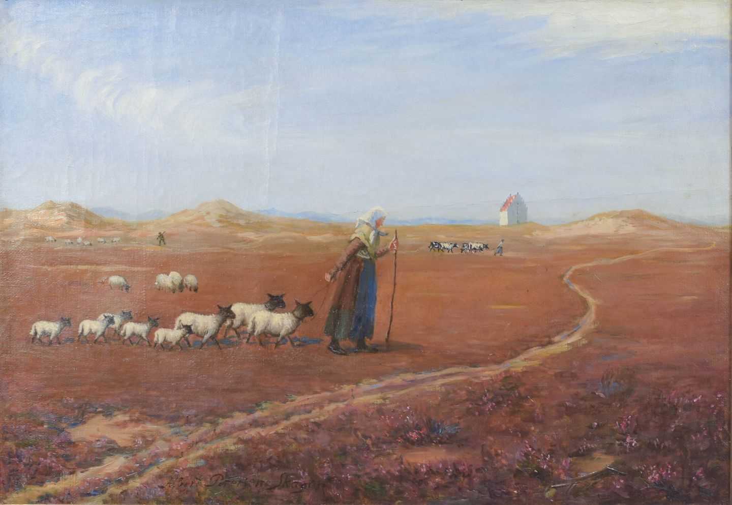 Naturalistisk landskabsmotiv med hyrde og fåreflok i åbent terræn, udført i en rolig og stemningsfuld farveholdning. Kompositionen afspejler landlivets rytme omkring århundredeskiftet, med fokus på lys, rum og fortælling. Signeret.
