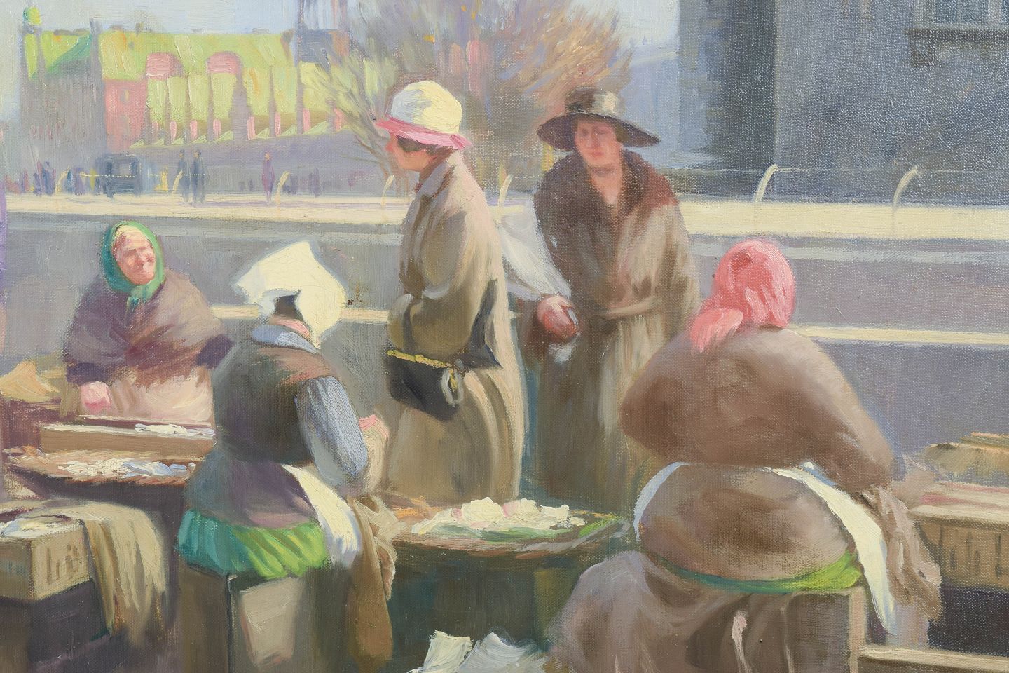 Stemningsfuld skildring af livet ved Gammel Strand i København med fiskesælgende koner og byens daglige liv, udført i et naturalistisk og lysfyldt maleri. Signeret.