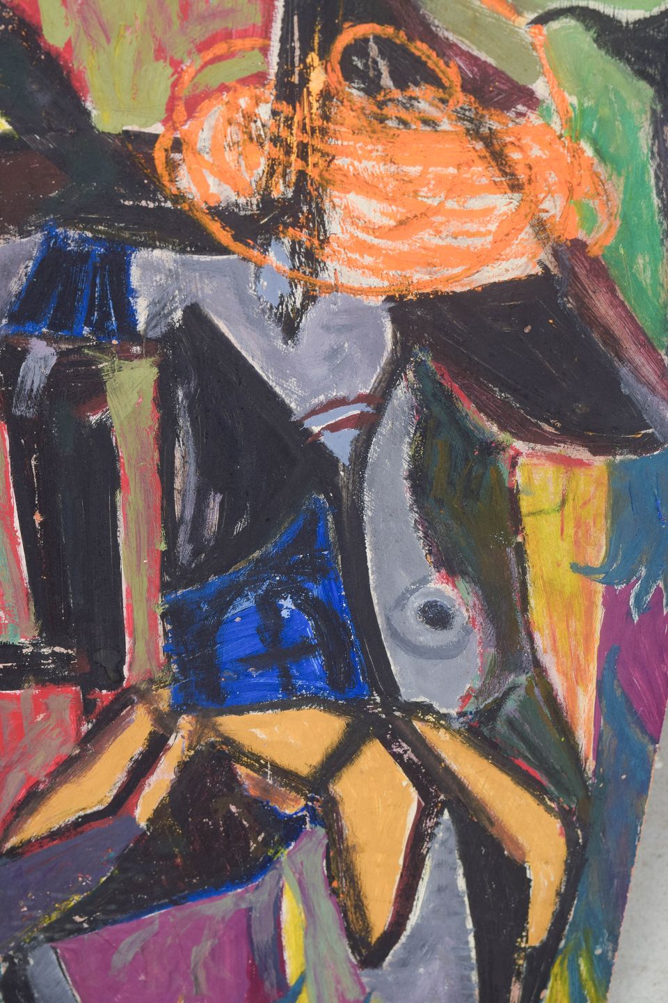 Ekspressivt og farverigt figurativt motiv med stiliseret fremstilling af kvindefigur udført i en abstrakt, modernistisk billedopbygning. Kompositionen er opbygget med kraftige konturer og kontrasterende farvefelter i klare og dybe nuancer. Signeret.