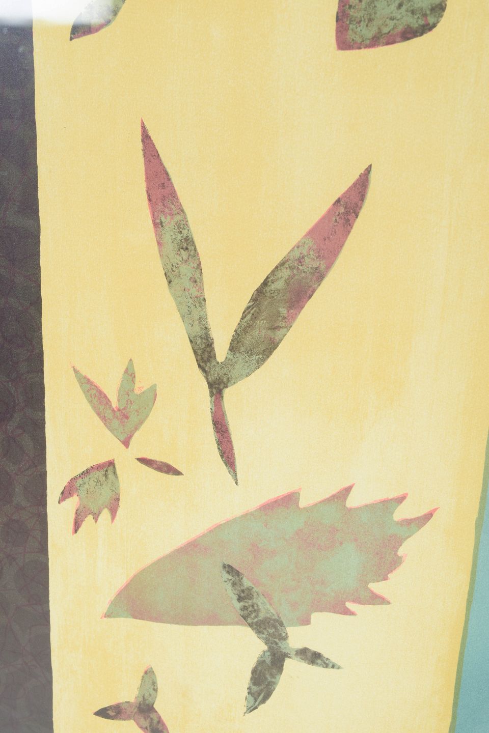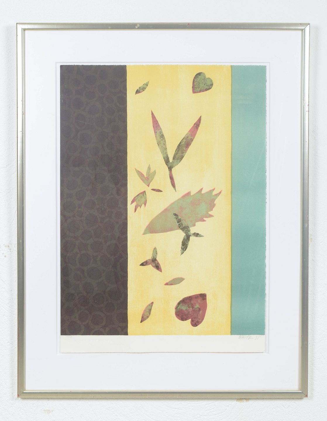Abstrakt komposition med svævende organiske former og dekorative elementer i bløde farveovergange, udført som farvelitografi, signeret og nummereret 106/150, dateret 1995.