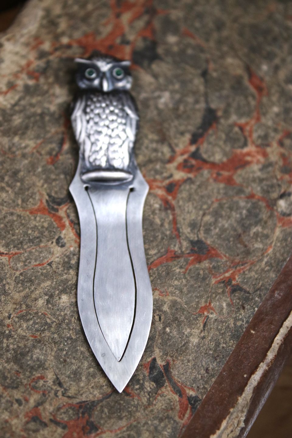 Gammelt bogmærke i sølv i form af en lille ugle med grønne glas øjne...