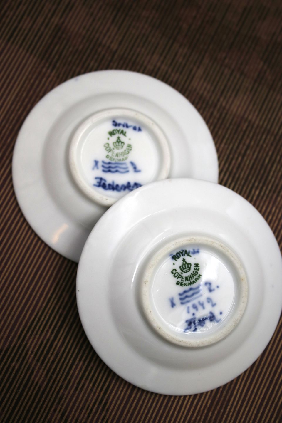 2 stk. gamle Musselmalet Halvblonde små assietter fra Royal Copenhagen , med datering og stemplet 1942. Dia.: 7,3cm.