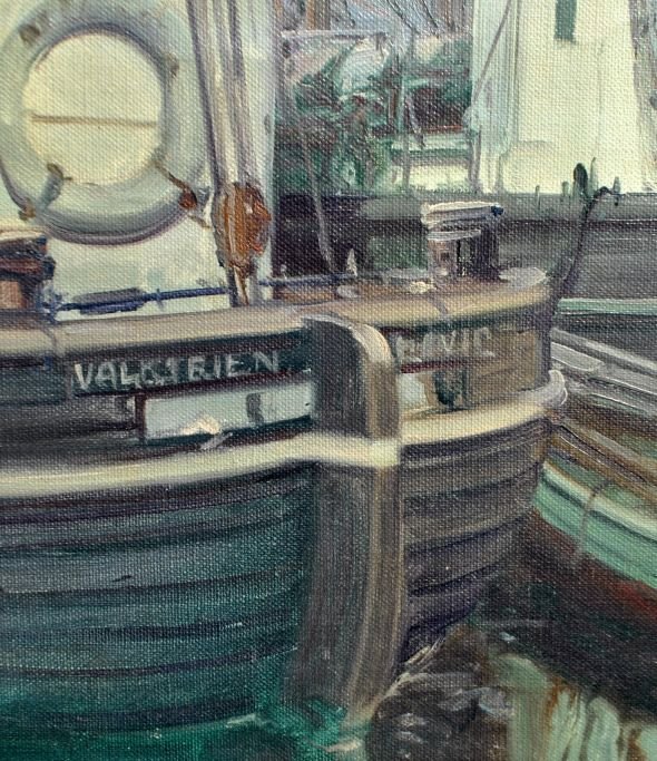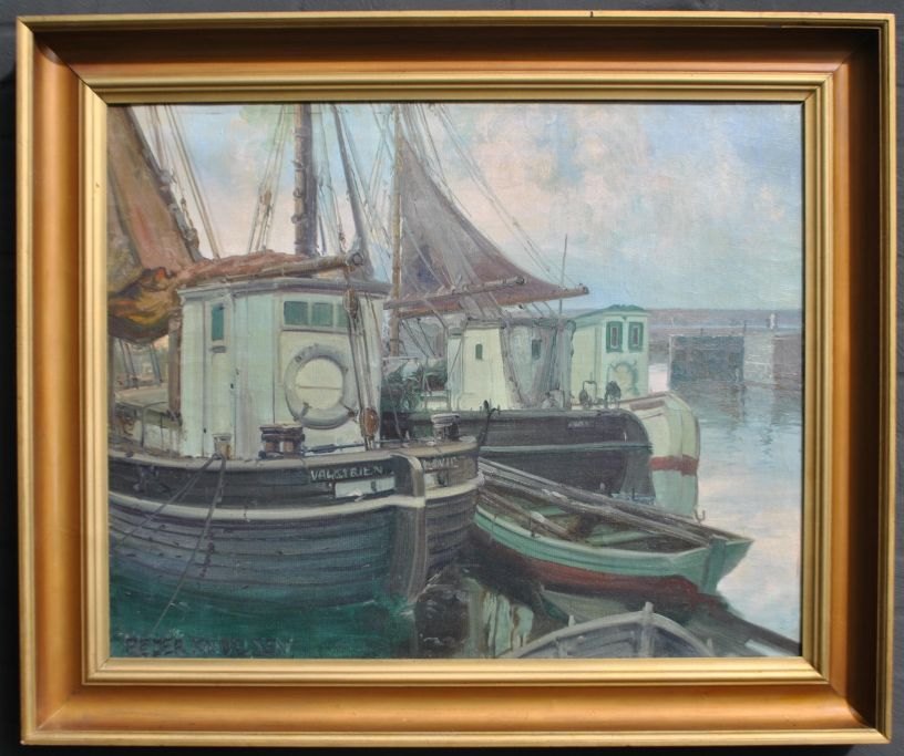 Knudsen, Peder Jacob Marius (1868 - 1944) Danmark: Fiskekuttere i en havn. Signeret. Olie på lærred. 65 x 85 cm.