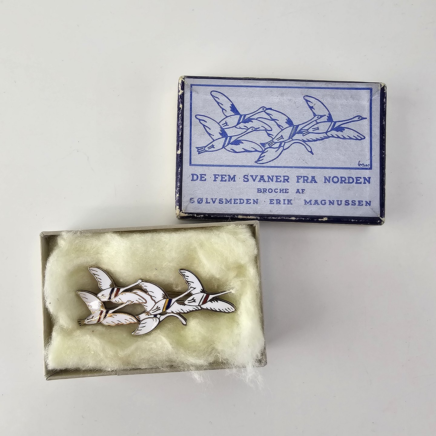 Broche i sterling sølv og emalje med motiv af fem svaner dekoreret med farver for de fem nordiske lande