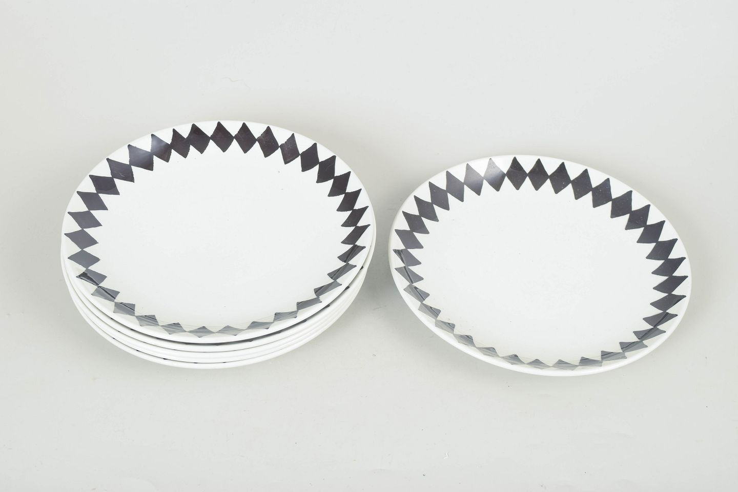 Sæt bestående af seks små frokosttallerkener i porcelæn med karakteristisk sort rudemønster, udført i et enkelt og funktionelt formsprog fra perioden.