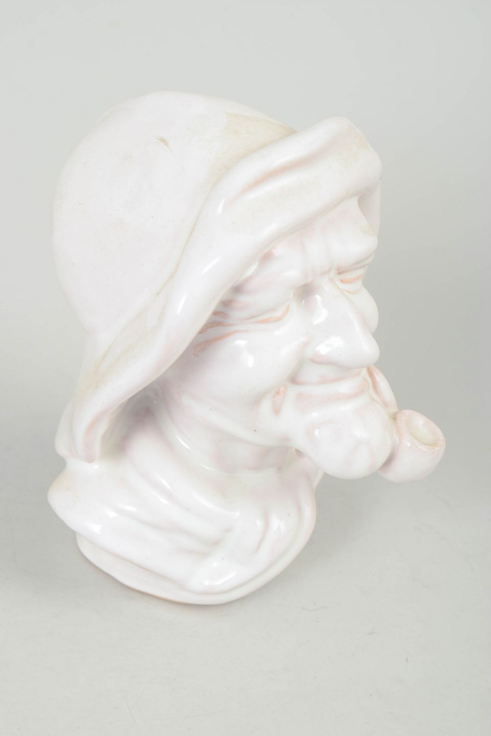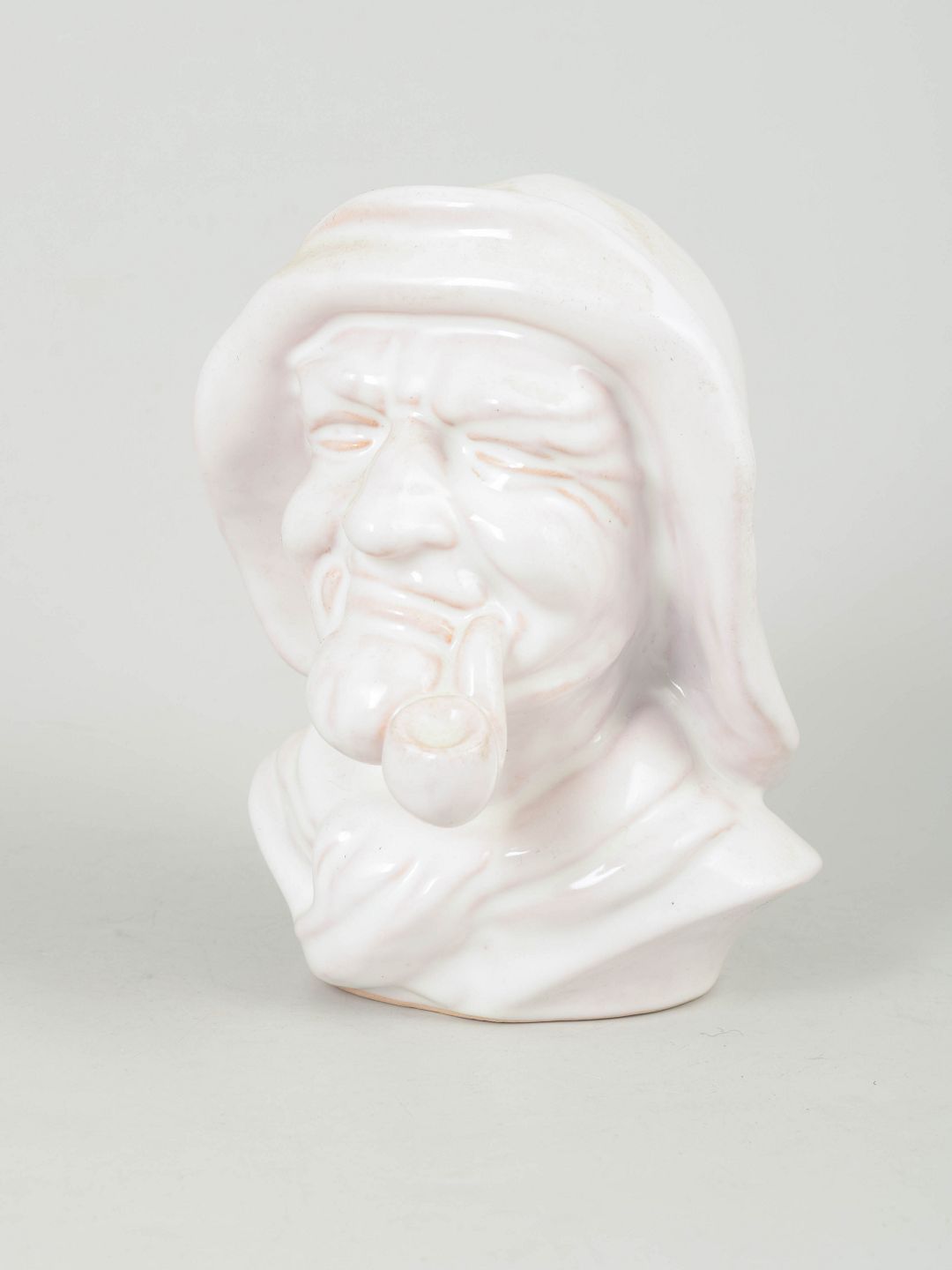 Naturalistisk udført porcelænsbuste forestillende en ældre fisker med pibe, modelleret med fine ansigtstræk og karakterfuldt udtryk i hvid glasur.
