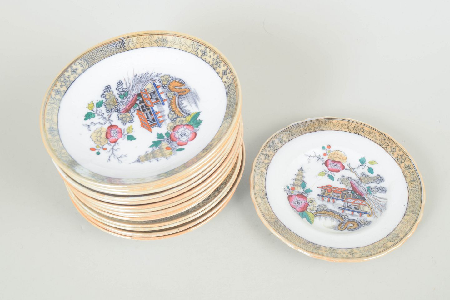 Decorative small faience plates with polychrome decoration in an orientalist Japanese style featuring pagoda motifs, buildings, bird and floral elements. Model Japan, produced between 1866–1925 and dated to the 1880s.