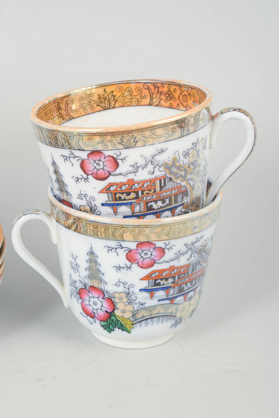 Large faience cups with matching saucers, decorated in a polychrome orientalist Japanese style featuring pagoda motifs, buildings, bird and floral elements. Model Japan, produced between 1866–1925 and dated to the 1880s.