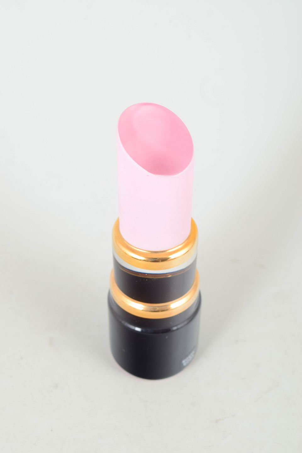 Slankt opbygget glasskulptur i form af en læbestift, i lagdelte former med cylindrisk base i mørkt glas, ringformede elementer i gyldne og klare toner samt skråt afskåret top i rosa glas.